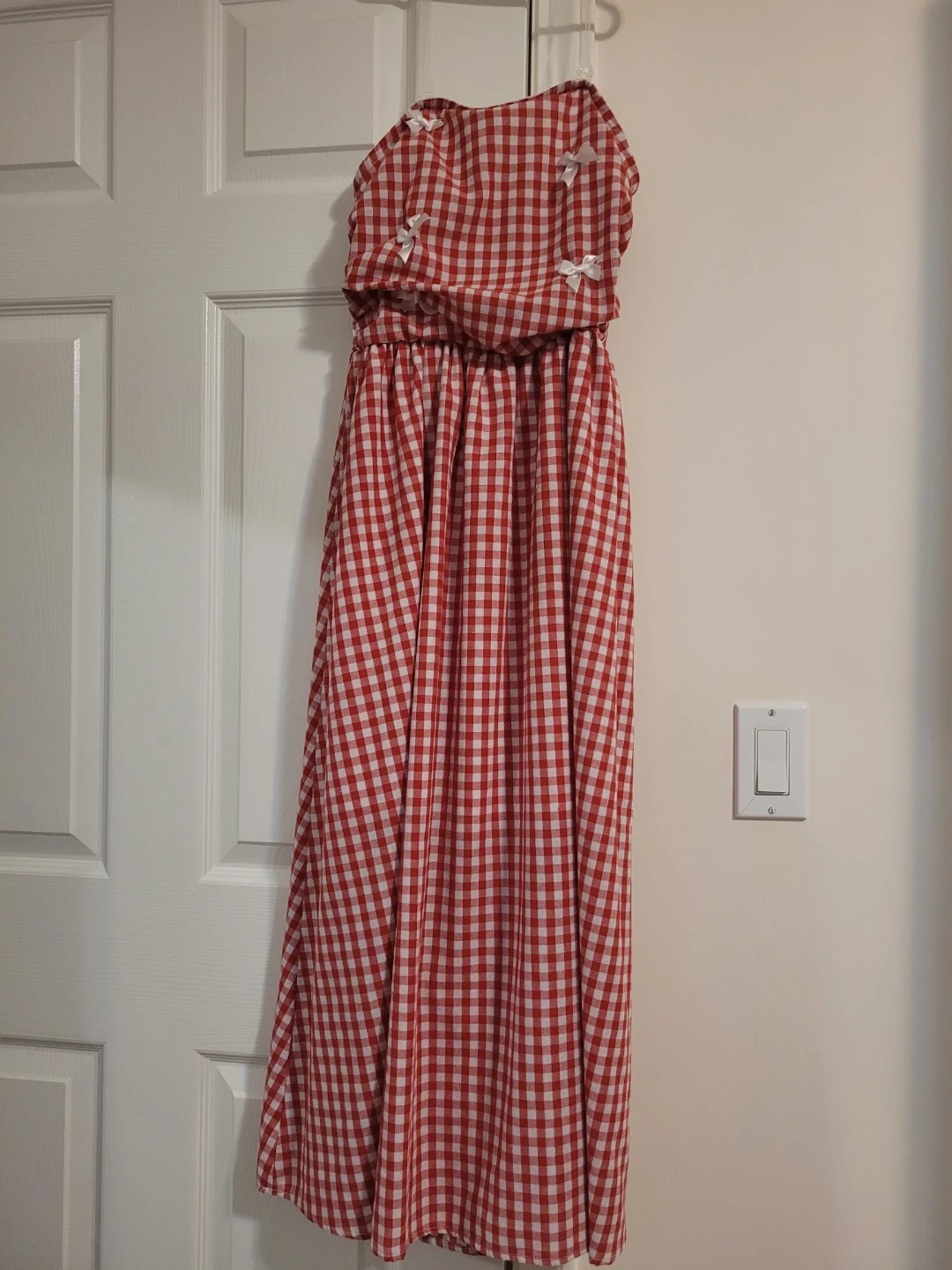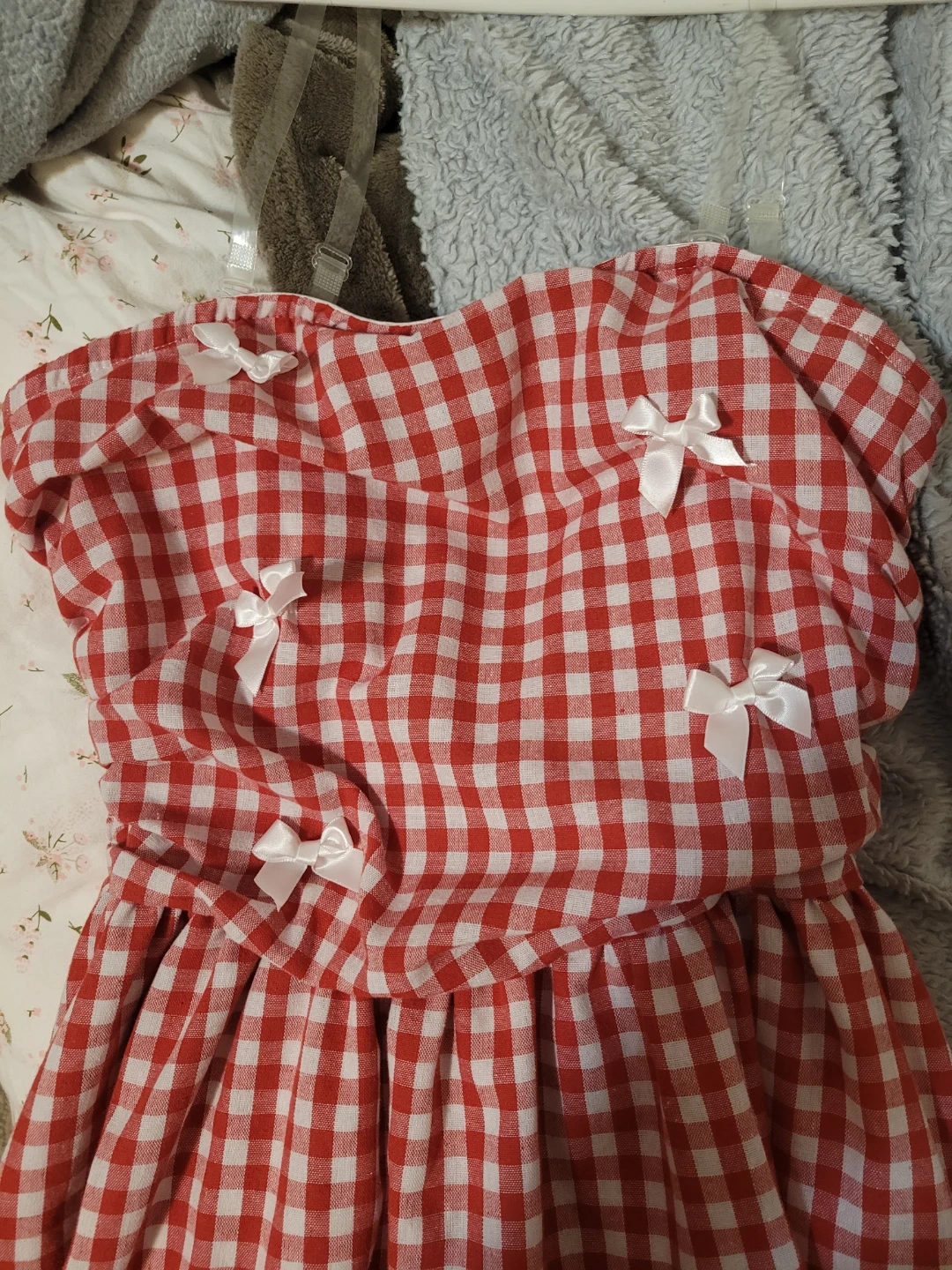 Here's a cute red and white gingham dress! It has a smocked bodice and sweet little bows on the front. Perfect for summer