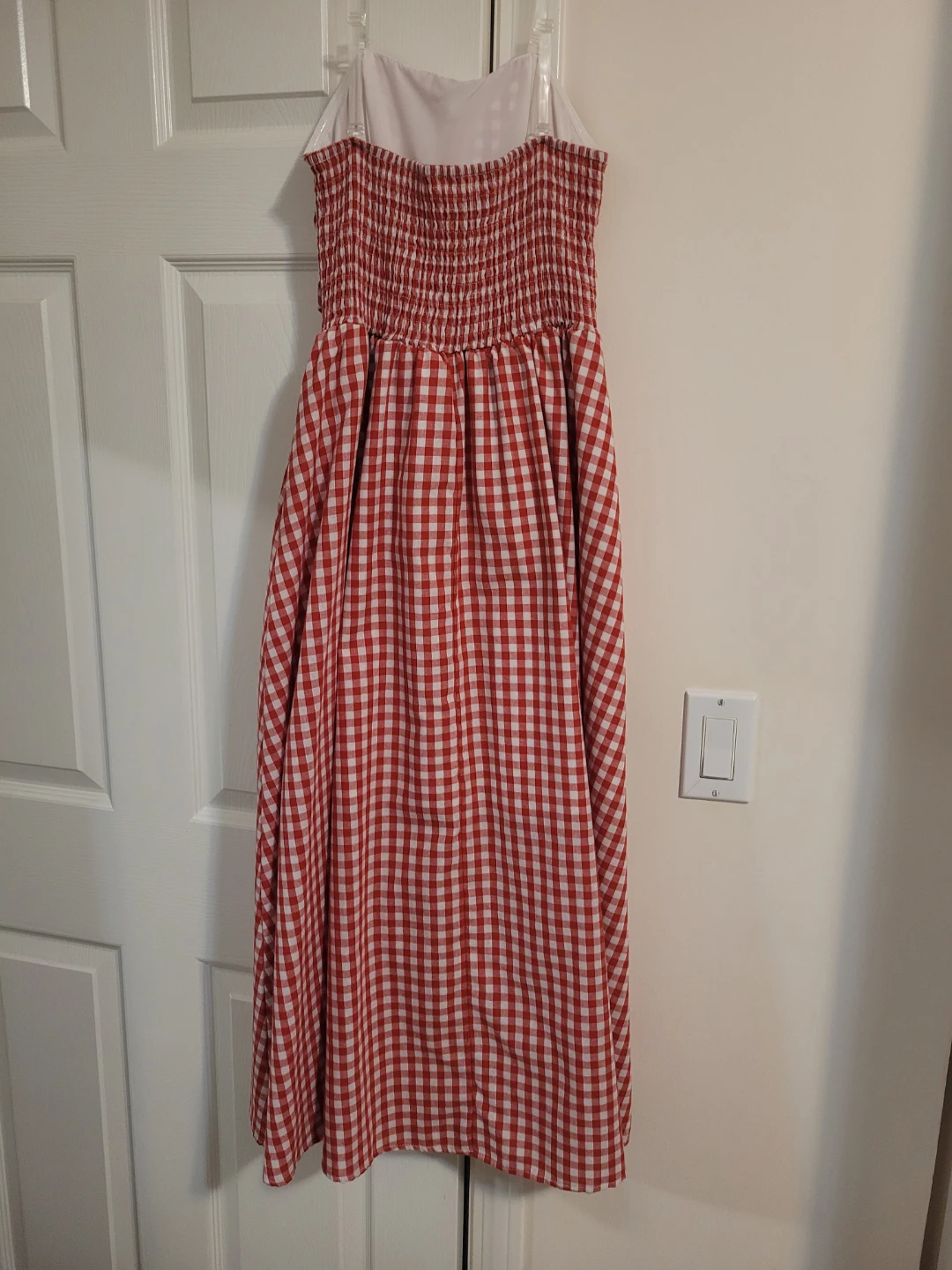 Here's a cute red and white gingham dress! It has a smocked bodice and sweet little bows on the front. Perfect for summer