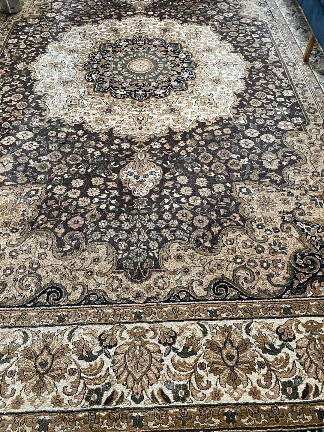 Beautiful area rug with intricate floral patterns and a central medallion. Features a rich colour palette of browns, beiges, and creams. It's generously sized to anchor a living room or dining area. Adds a touch of classic elegance to any home!
