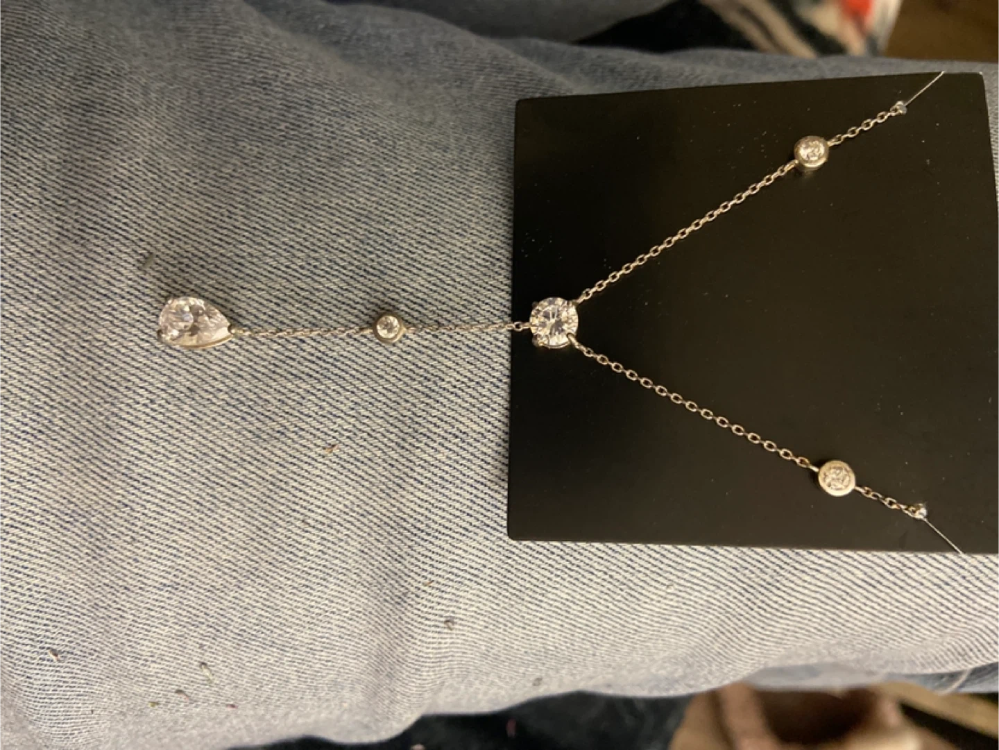 A delicate sterling silver chain necklace featuring a central round-cut stone with a striking pear-shaped drop. It's adorned with smaller clear stones along the chain. This necklace adds a touch of glamour to any outfit!