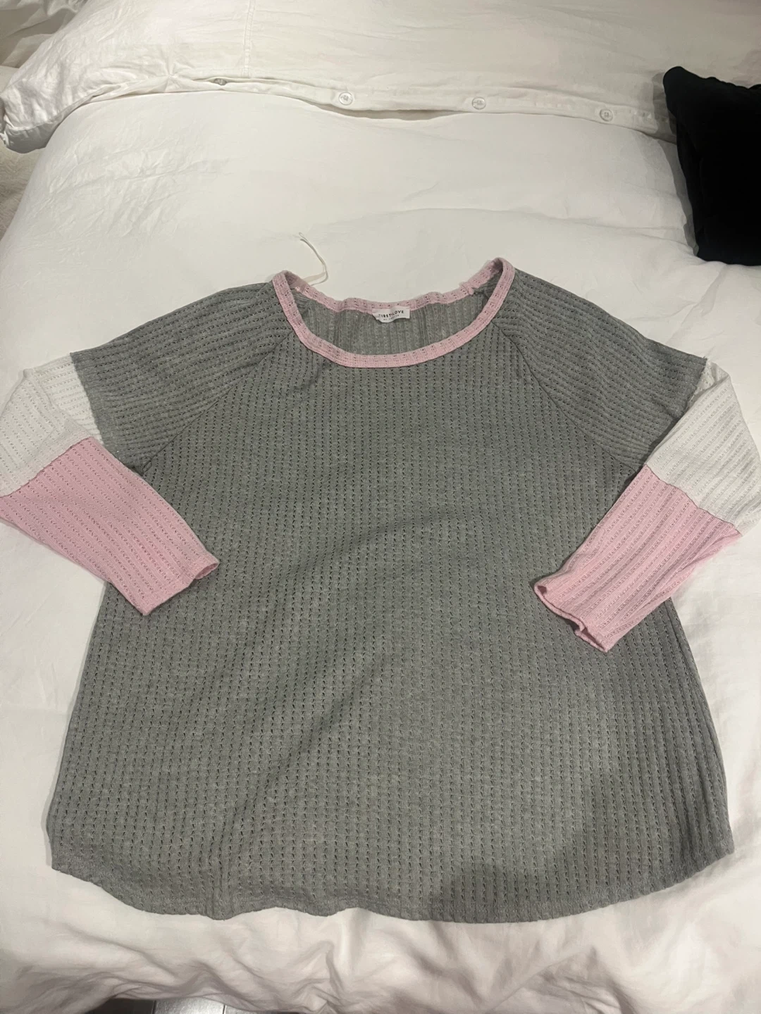 Comfy waffle knit top with colourblock sleeves. Features a grey body with pink and white accents on the sleeves and pink trim around the neckline. It's a relaxed fit and in excellent condition. Originally purchased from boutique store in Toronto. Only worn once.