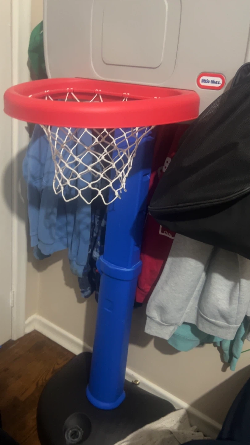This is a Little Tikes adjustable basketball hoop. It's blue with a red rim and white net. Perfect for little ones to practice their shooting! It's adjustable for growing kids.
