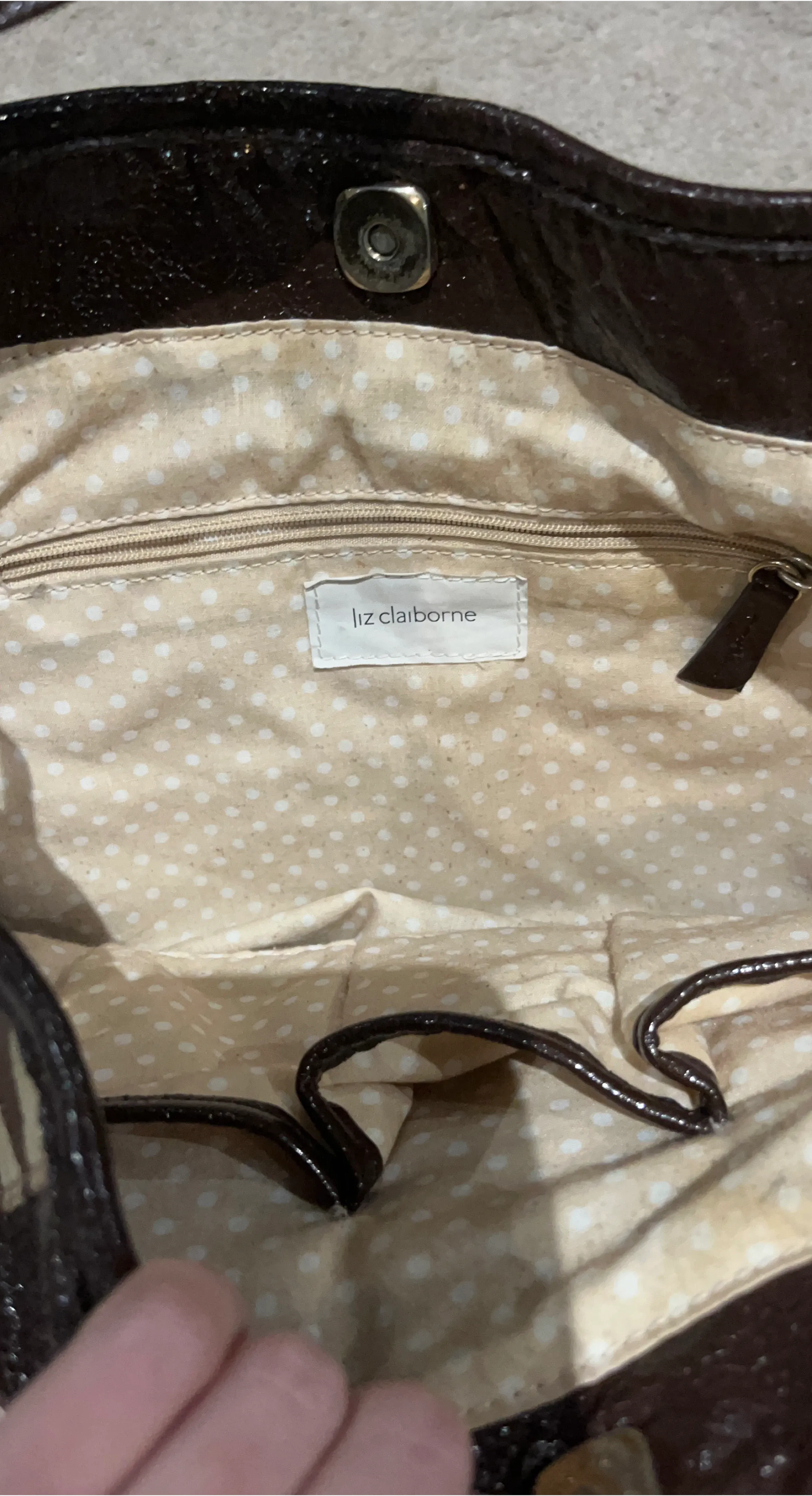 Stylish Liz Claiborne hobo bag with a patchwork design. It features multiple interior pockets for organization. A great bag for everyday use!