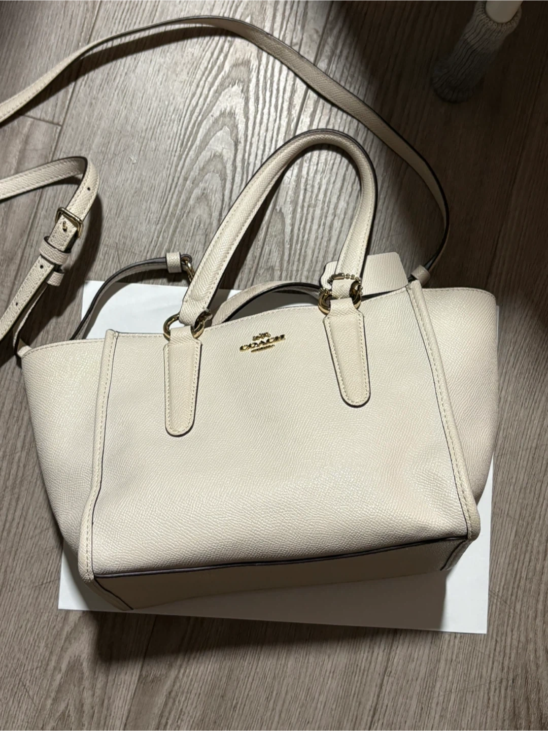 This is a Coach pebble leather tote bag in a cream colour. It has a spacious interior with a zippered pocket. The bag's textured leather offers durability.