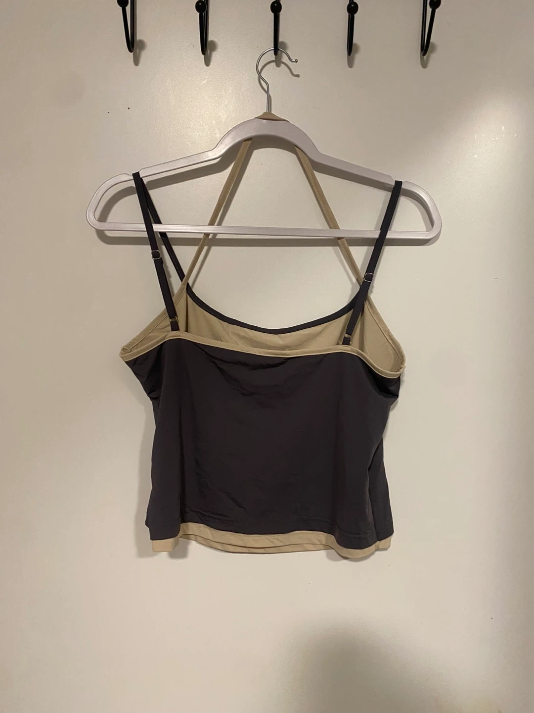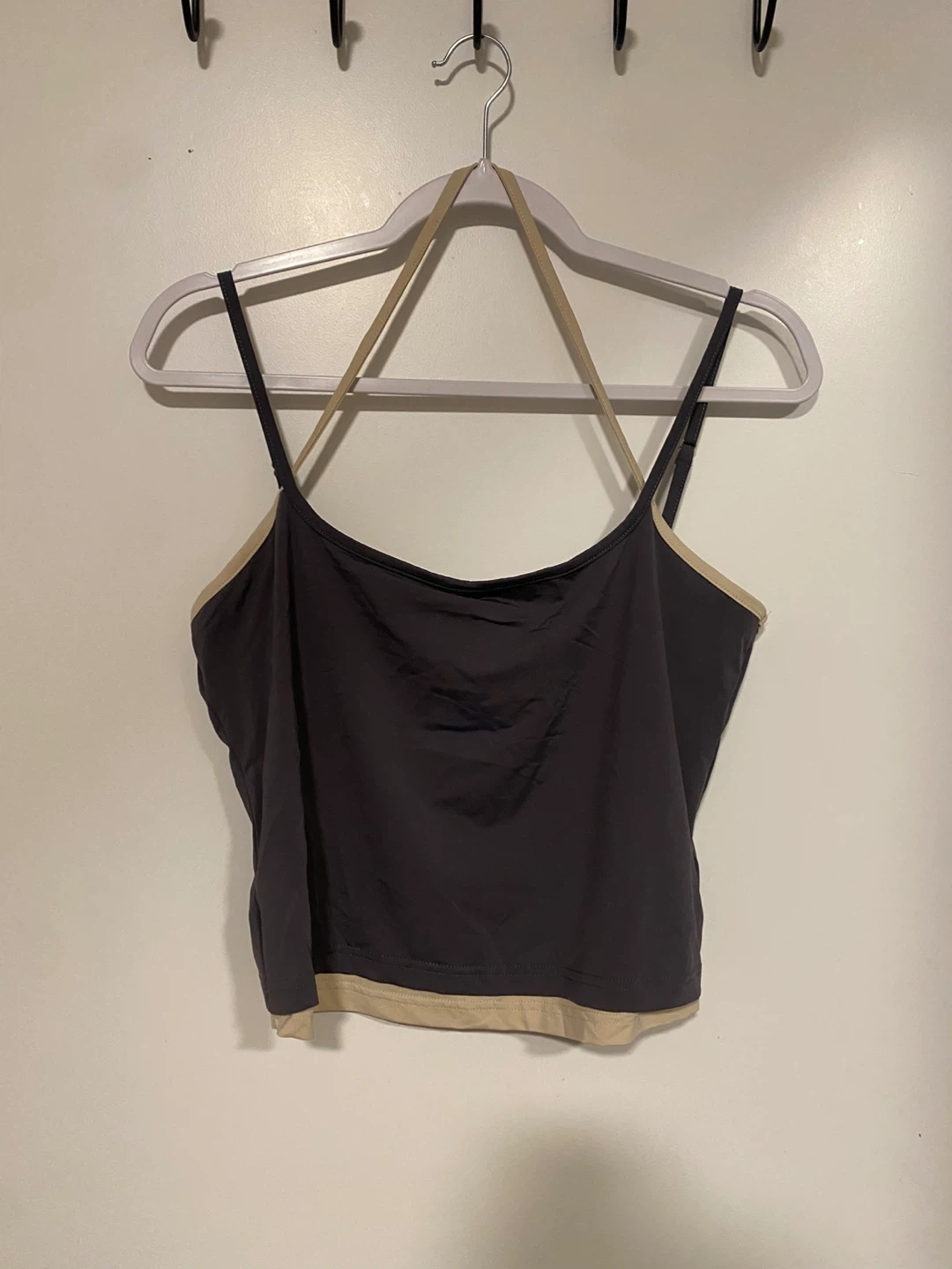 Sleek ribbed tank with thin double shoulder straps. Black body with cream trim along neckline and hem. Slim, stretchy fit ideal for layering or solo wear.