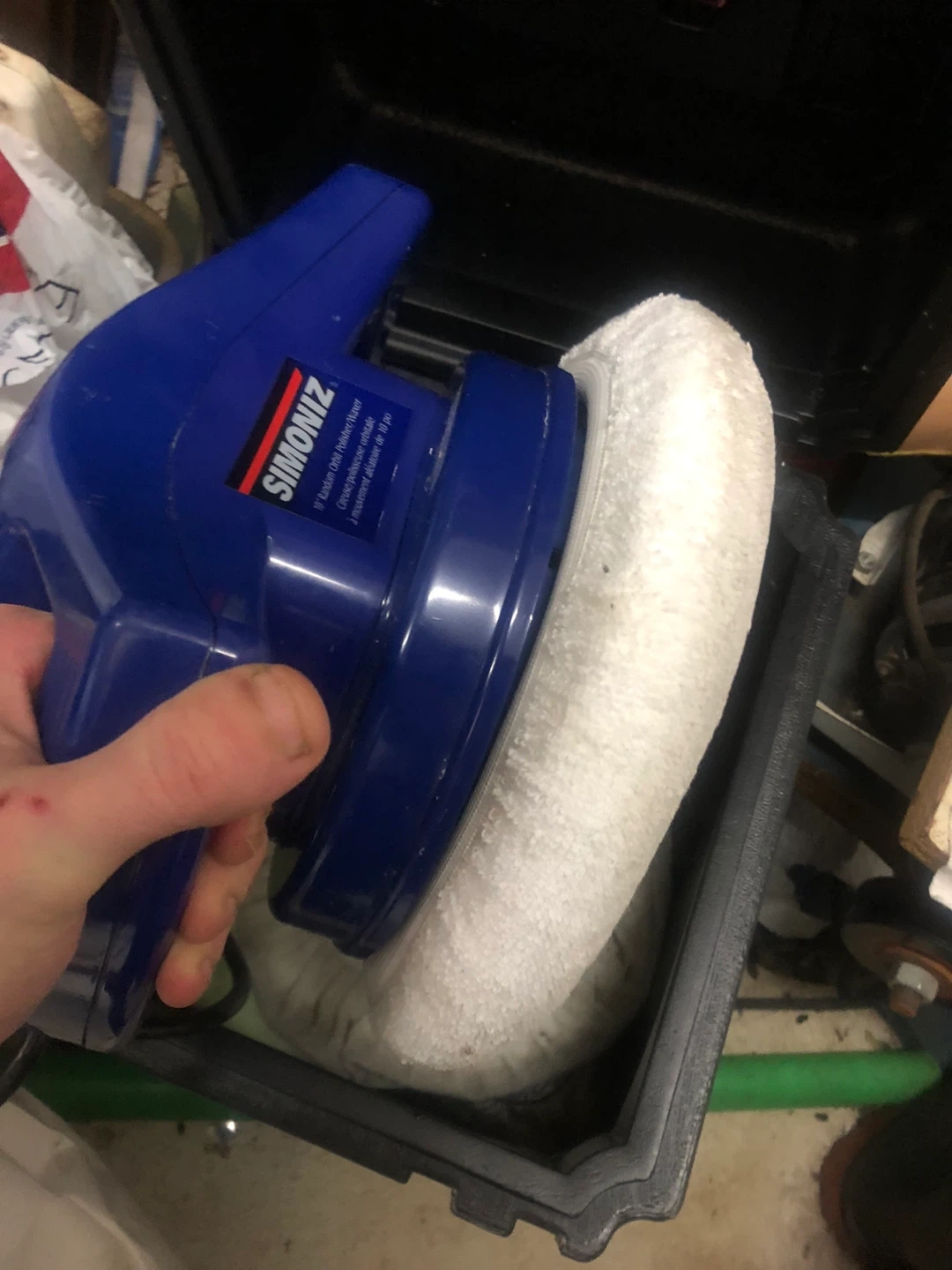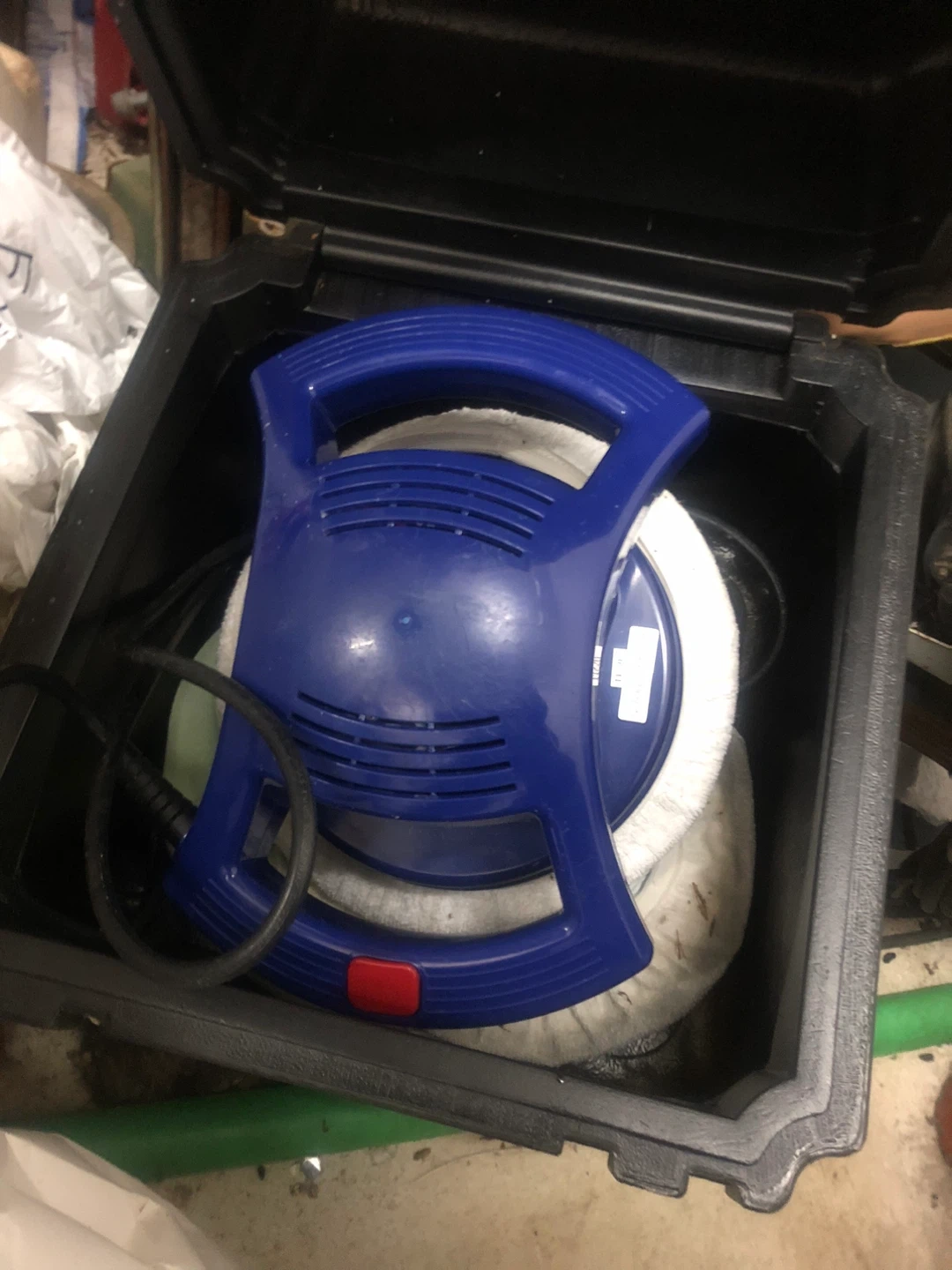 Simoniz 10 inch random orbit polisher and waxer. It's blue with a white buffing pad. Includes original case. Comes with power cord.