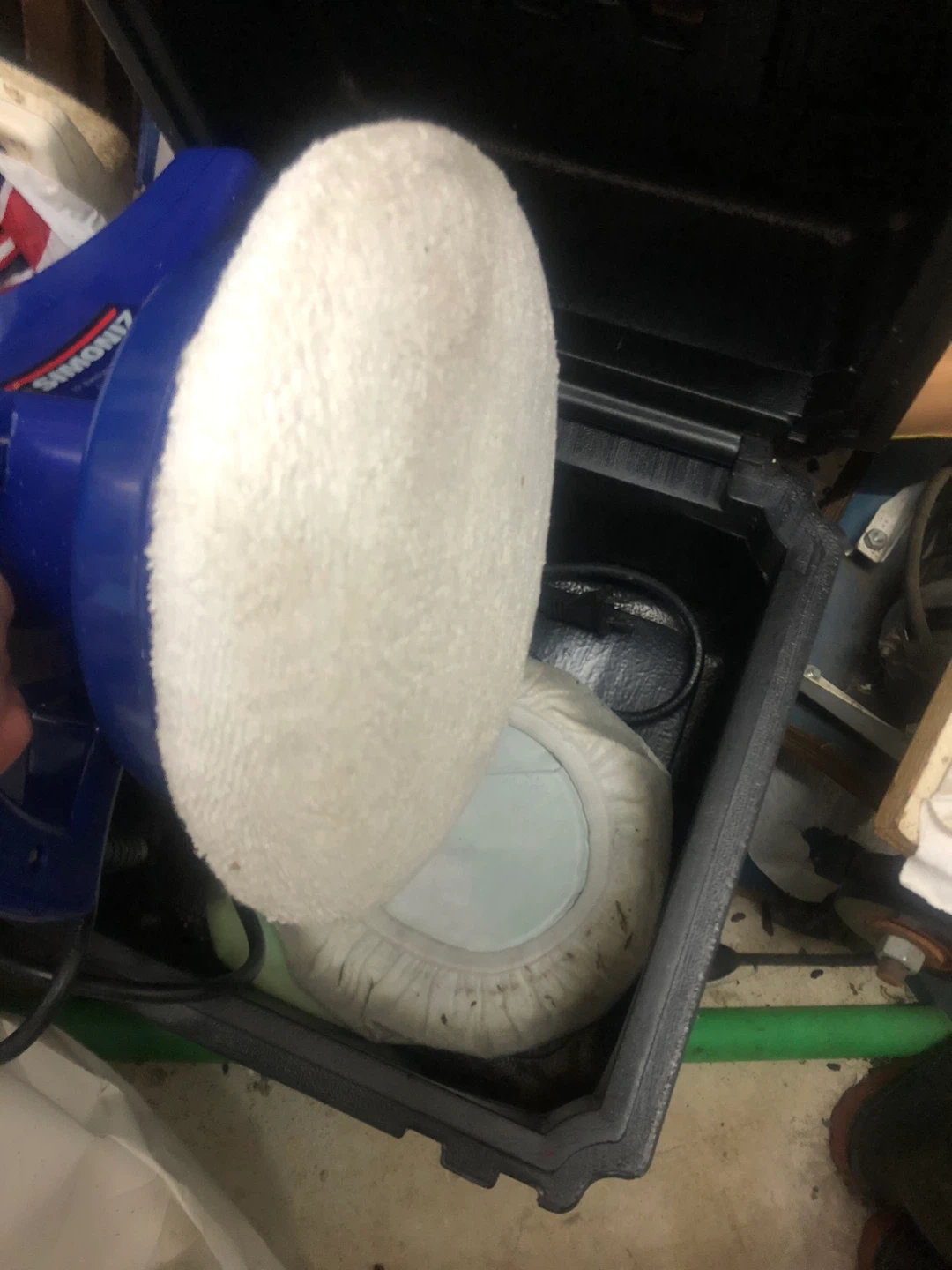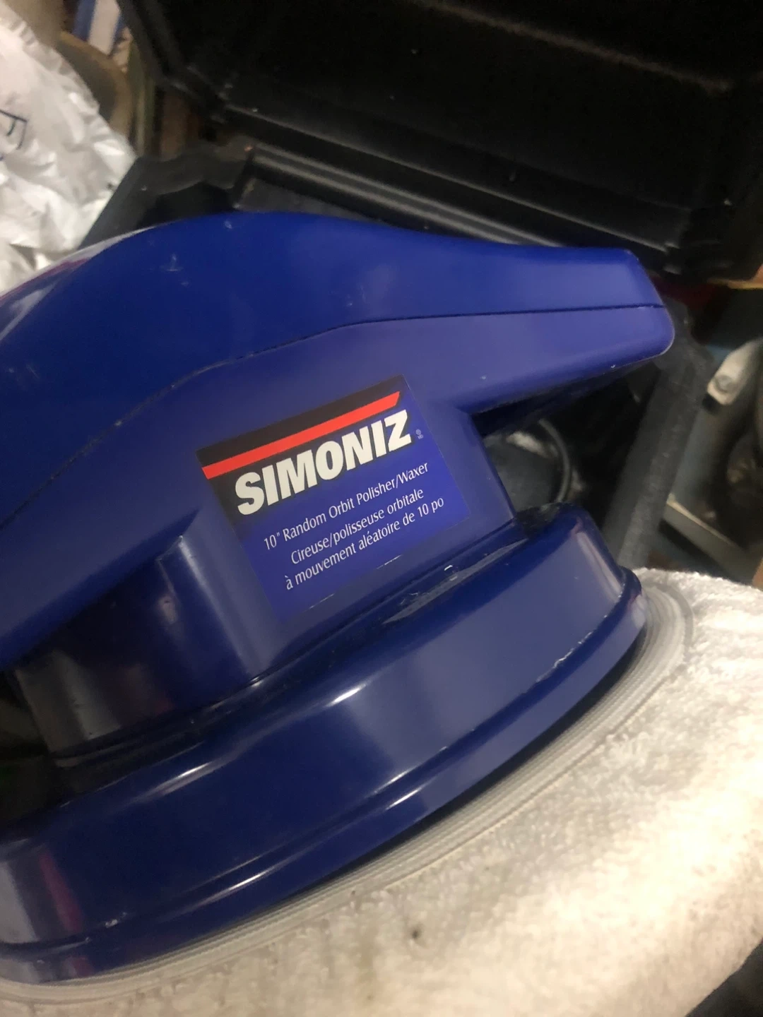 Simoniz 10 inch random orbit polisher and waxer. It's blue with a white buffing pad. Includes original case. Comes with power cord.