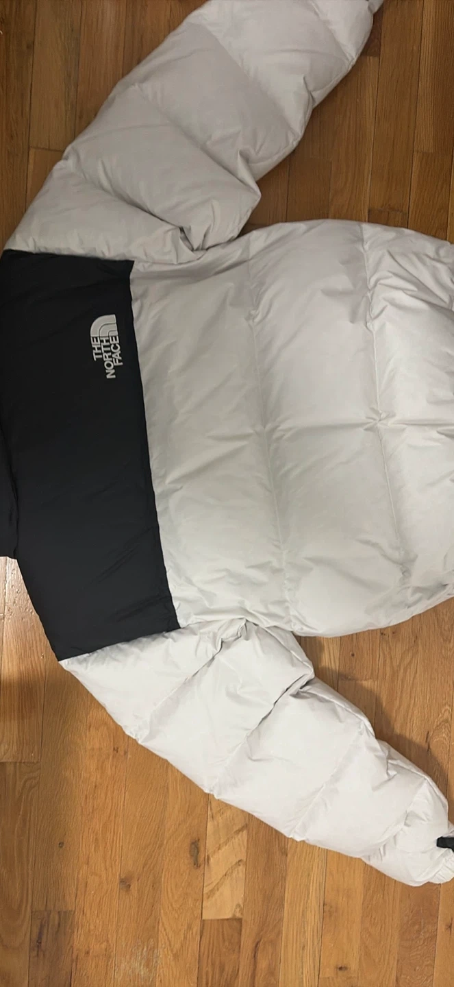 This is a puffer jacket from The North Face. It features a black and white color block design. It's made for cold weather protection.