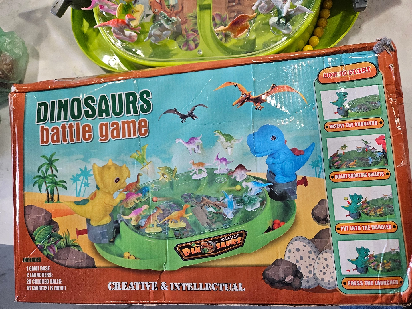 Dinosaurs Battle Game with two launchers and coloured balls! It includes 1 game base, 2 launchers, 20 coloured balls and 16 targets