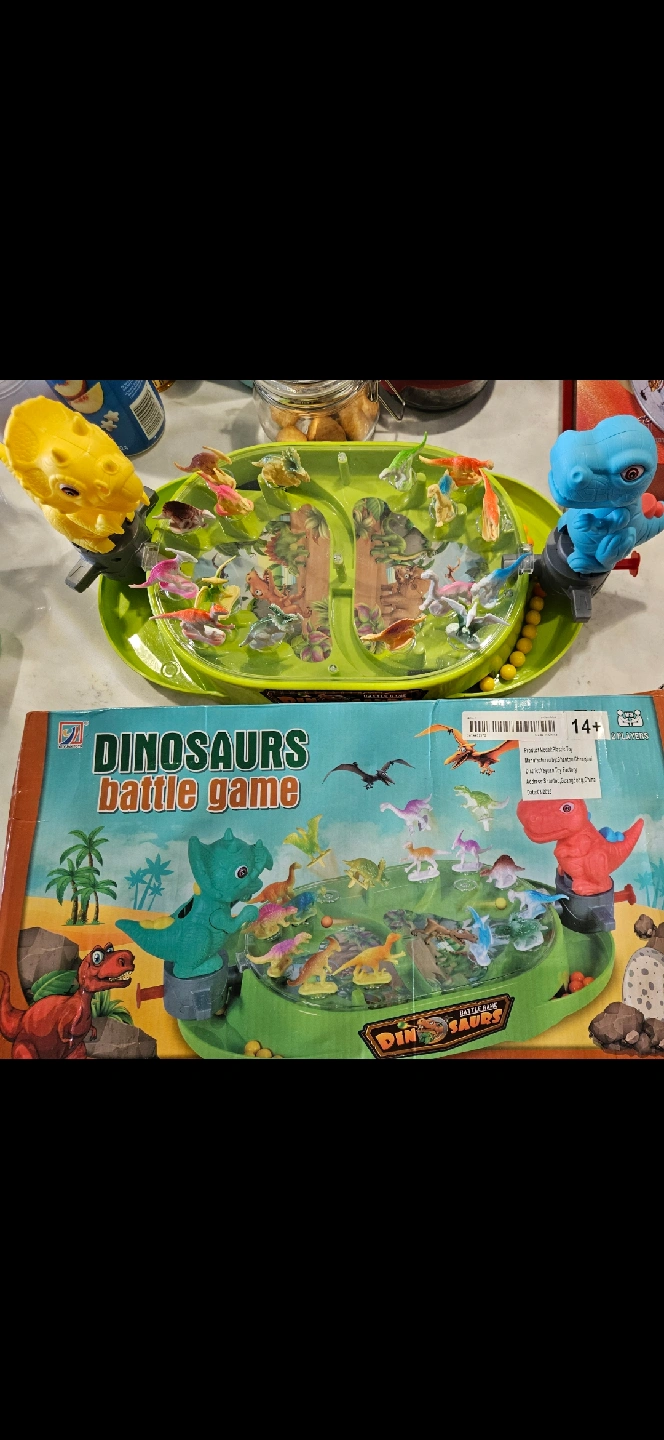 Dinosaurs Battle Game with two launchers and coloured balls! It includes 1 game base, 2 launchers, 20 coloured balls and 16 targets