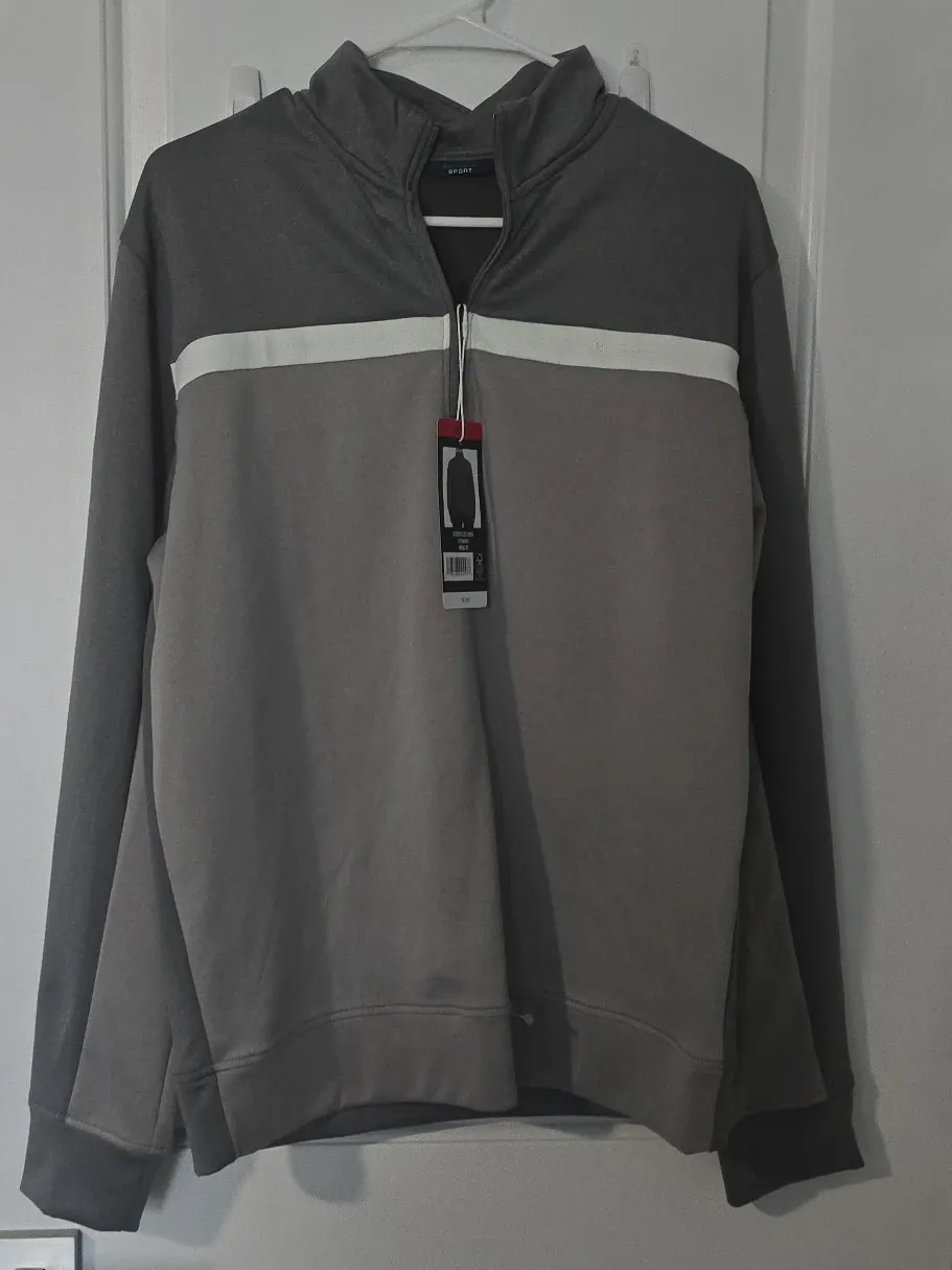 This men's sport quarter-zip pullover is grey with a white stripe across the chest. It features a mock neck and a zip closure. This is a size large.