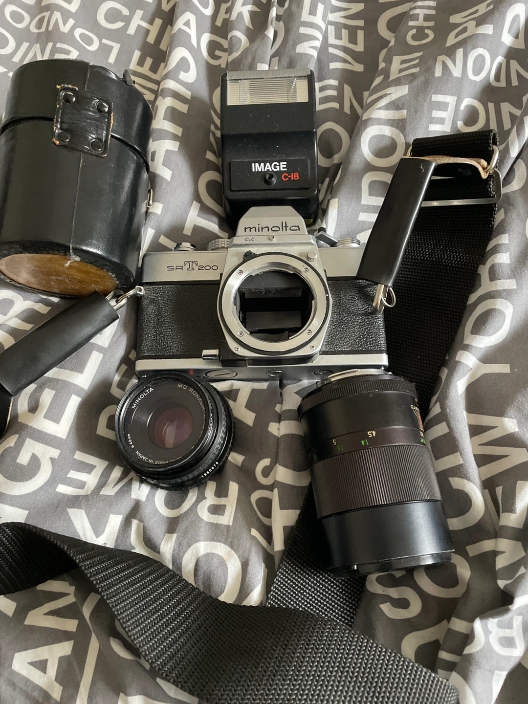 Vintage Minolta SRT 200 SLR film camera with an "IMAGE C-18" flash unit. It includes a Minolta MD Rokkor lens and another lens. Also comes with a protective carrying case and a shoulder strap. This kit's ready for your next film project!