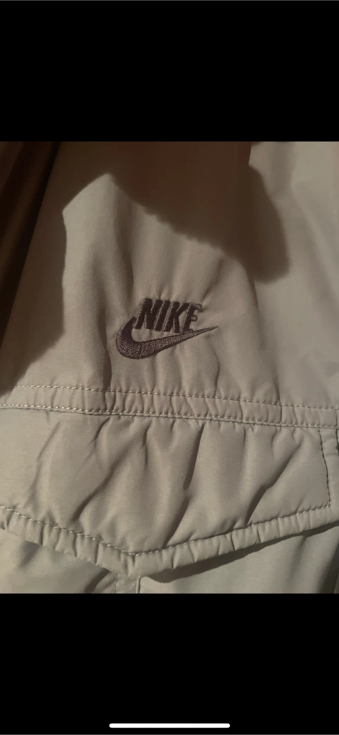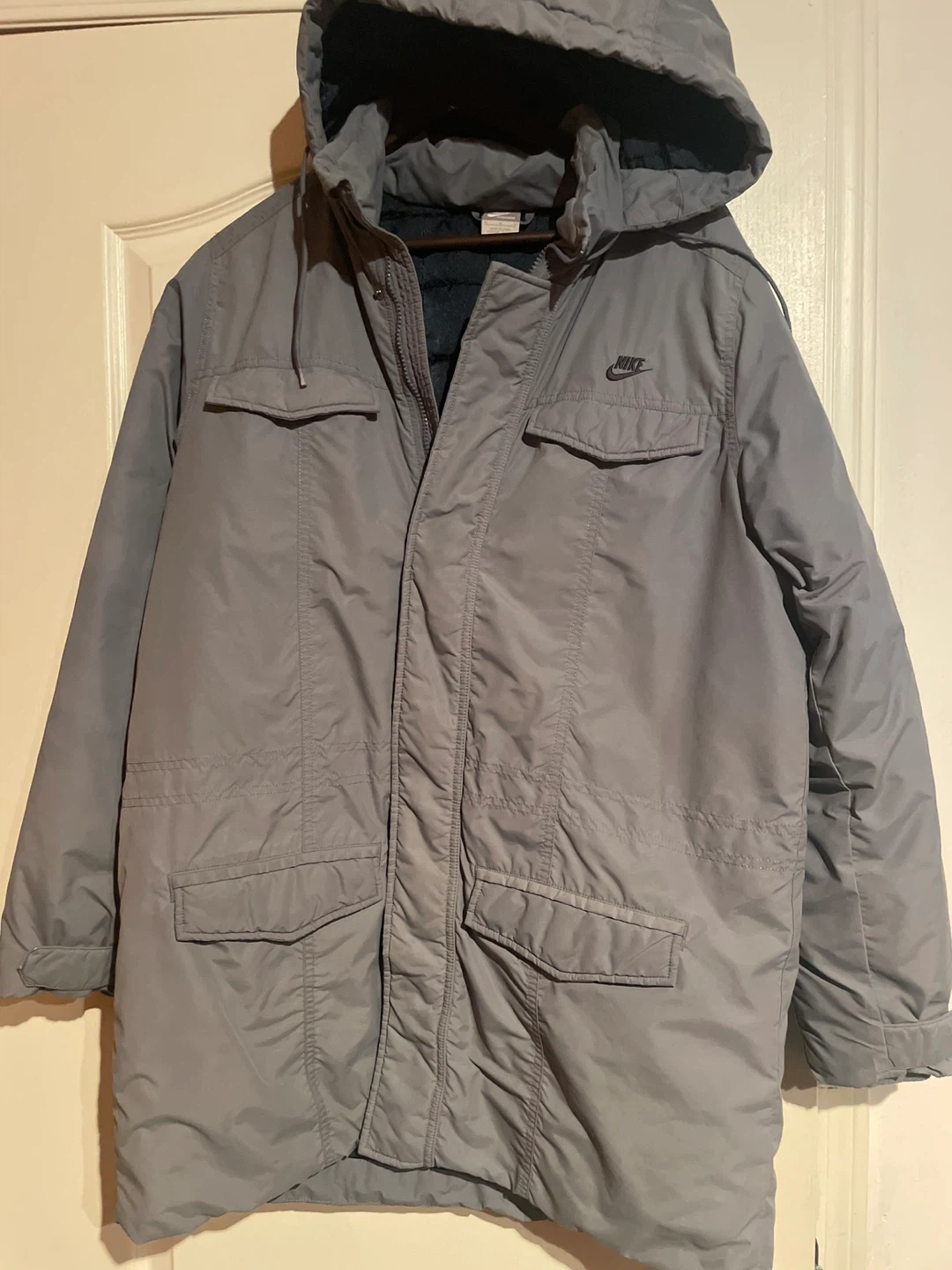 Stay warm this winter with this Nike parka jacket. It features a hooded design and multiple pockets for storage. The outer shell is a durable grey fabric.