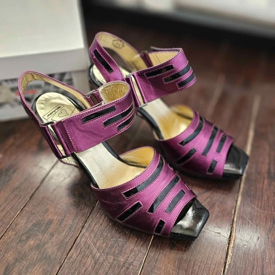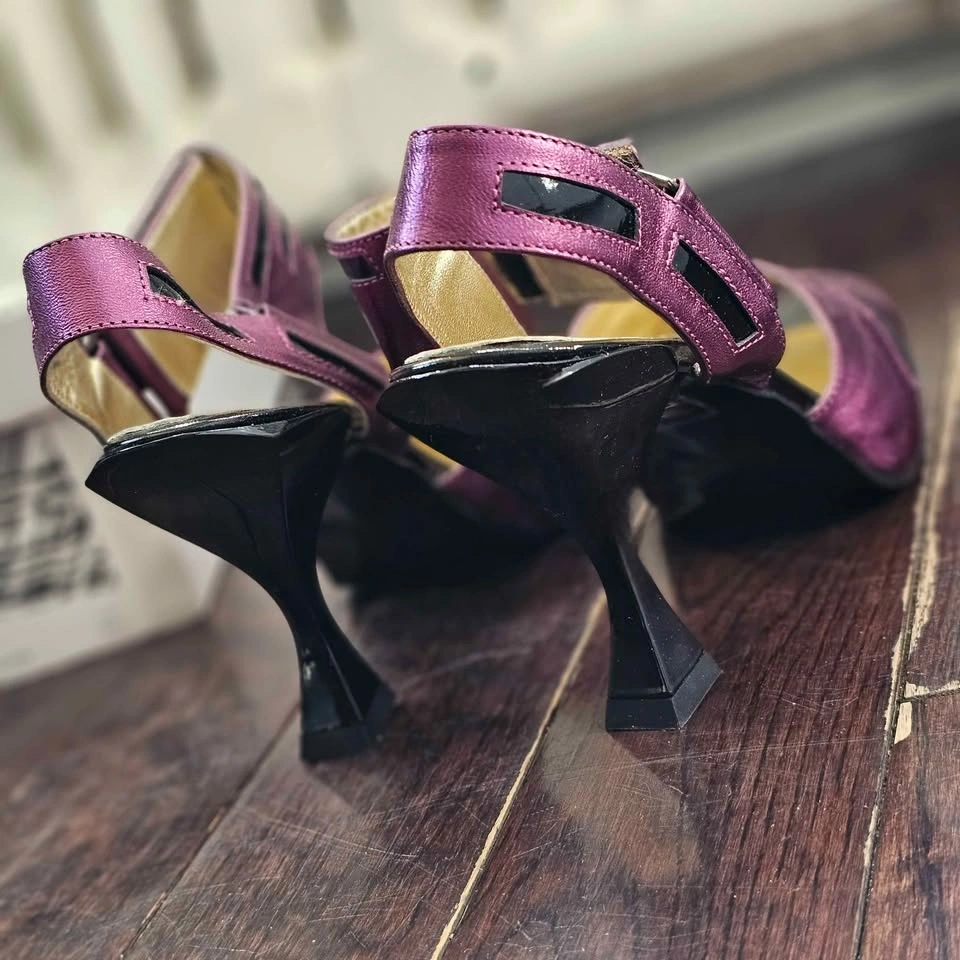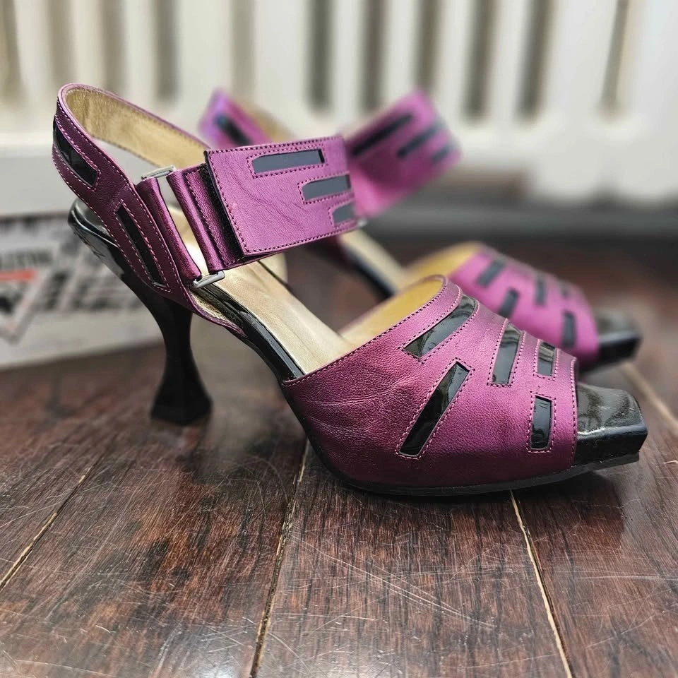 These statement heels feature Fluevog’s signature curved heel and a chic square toe. The metallic purple leather is accented with sleek black patent leather sections. Shoes close with adjustable hidden velcro strips. They have a leather insole, a cushioned footbed, and black leather soles.