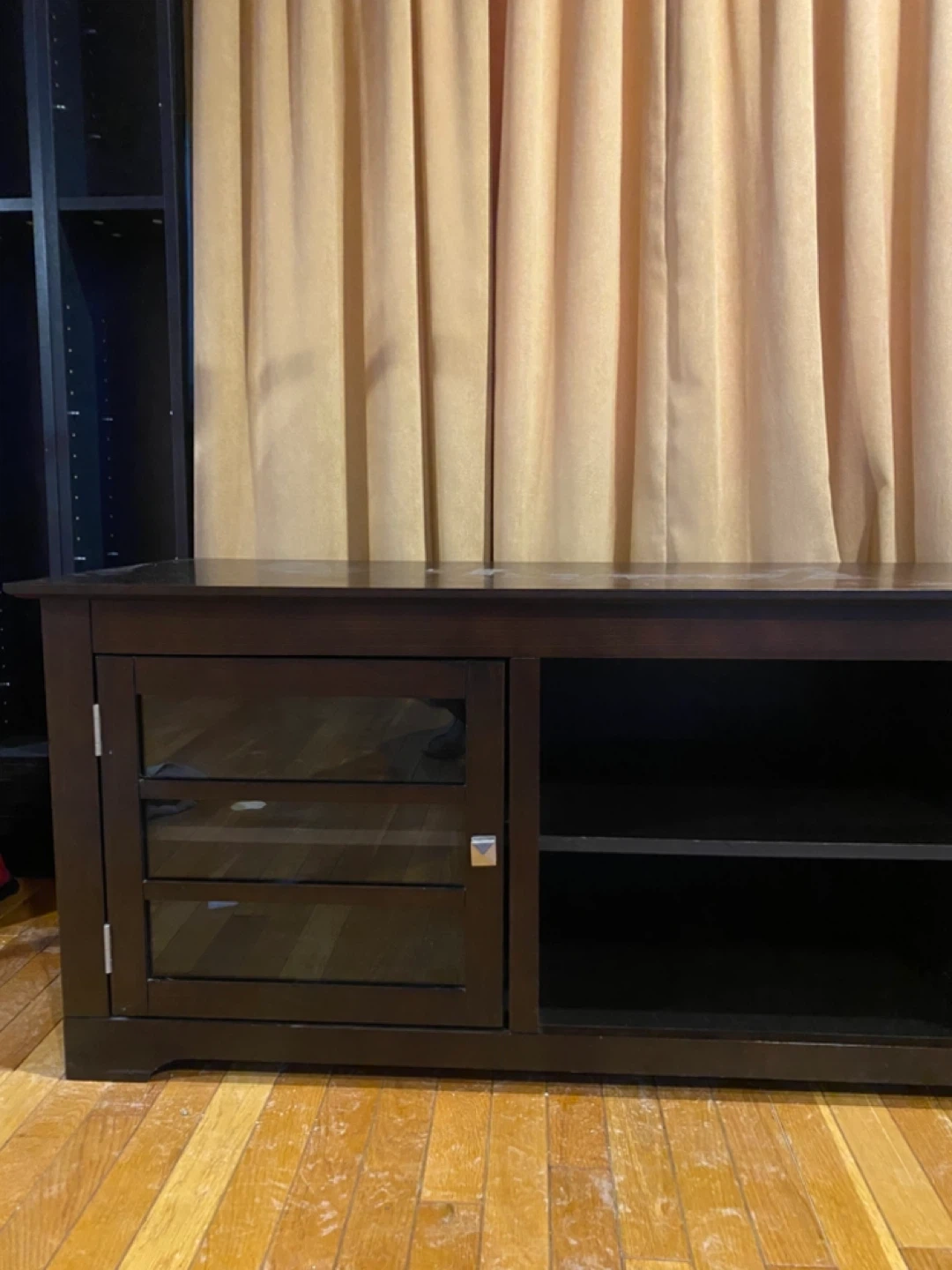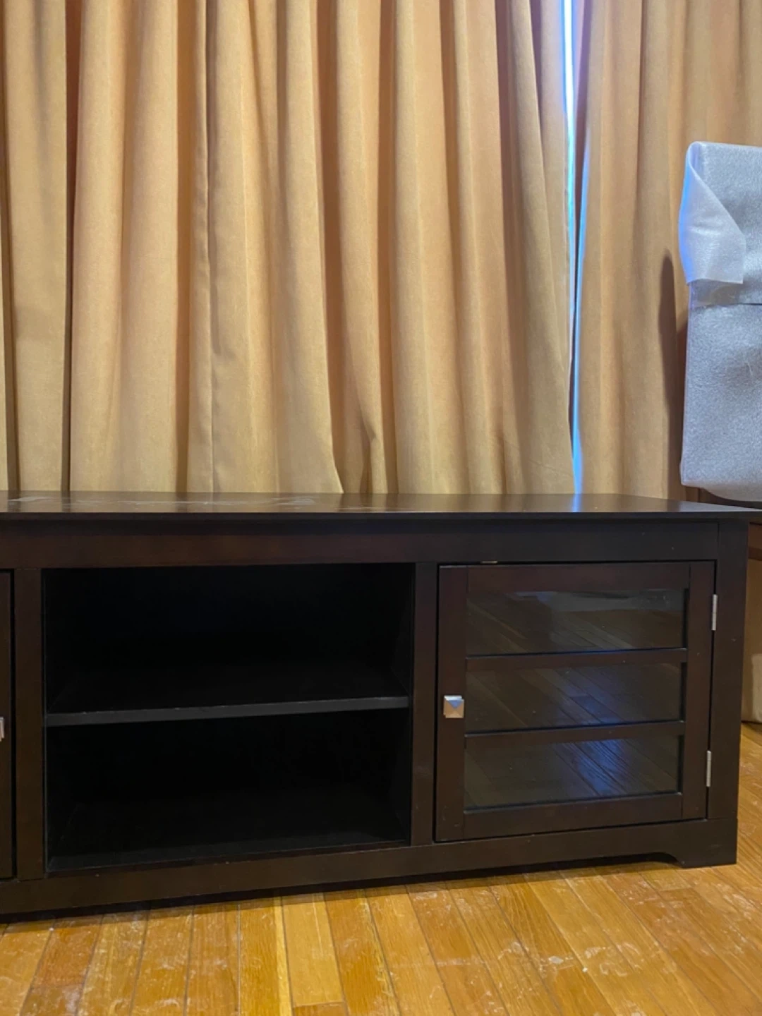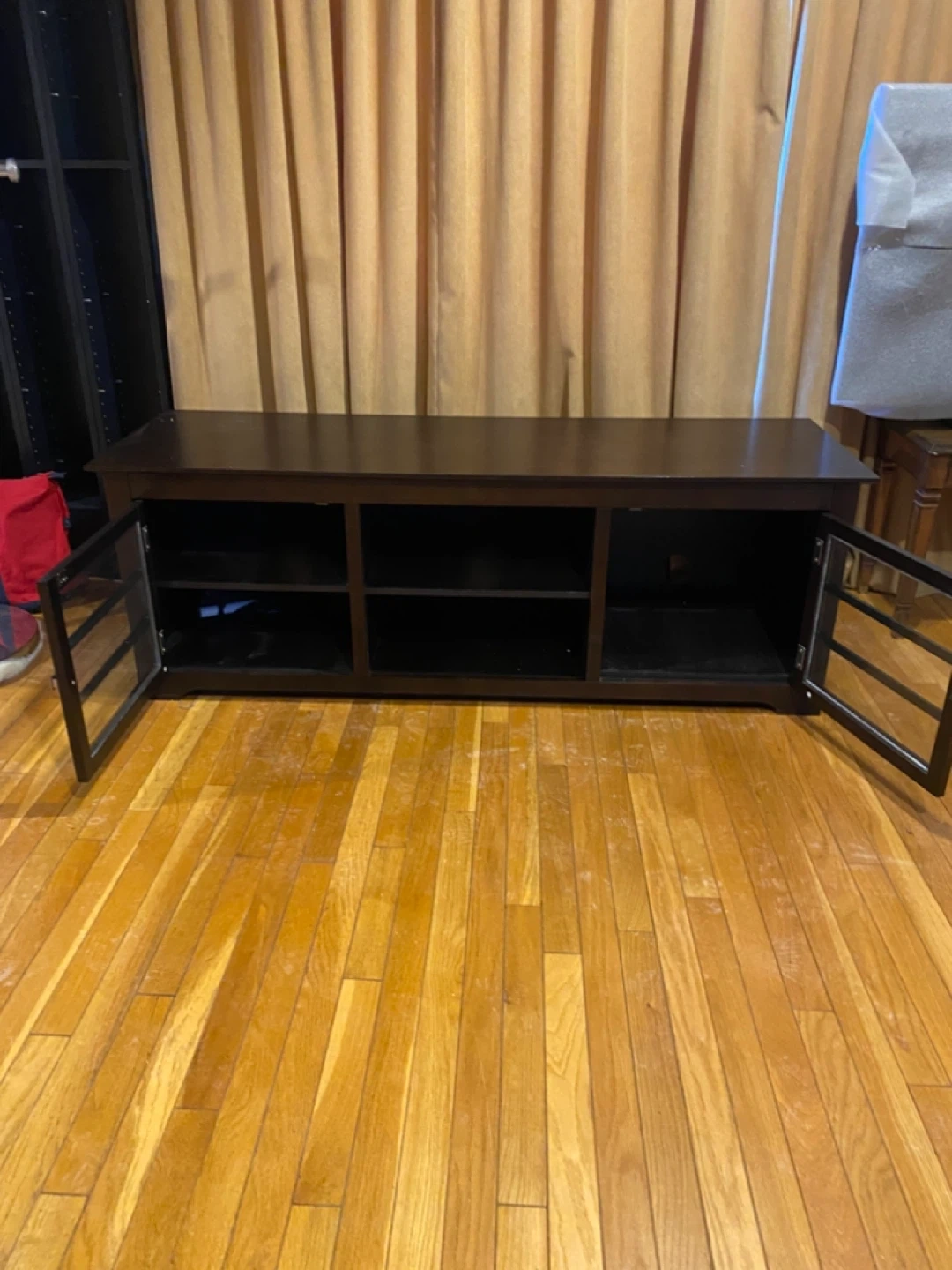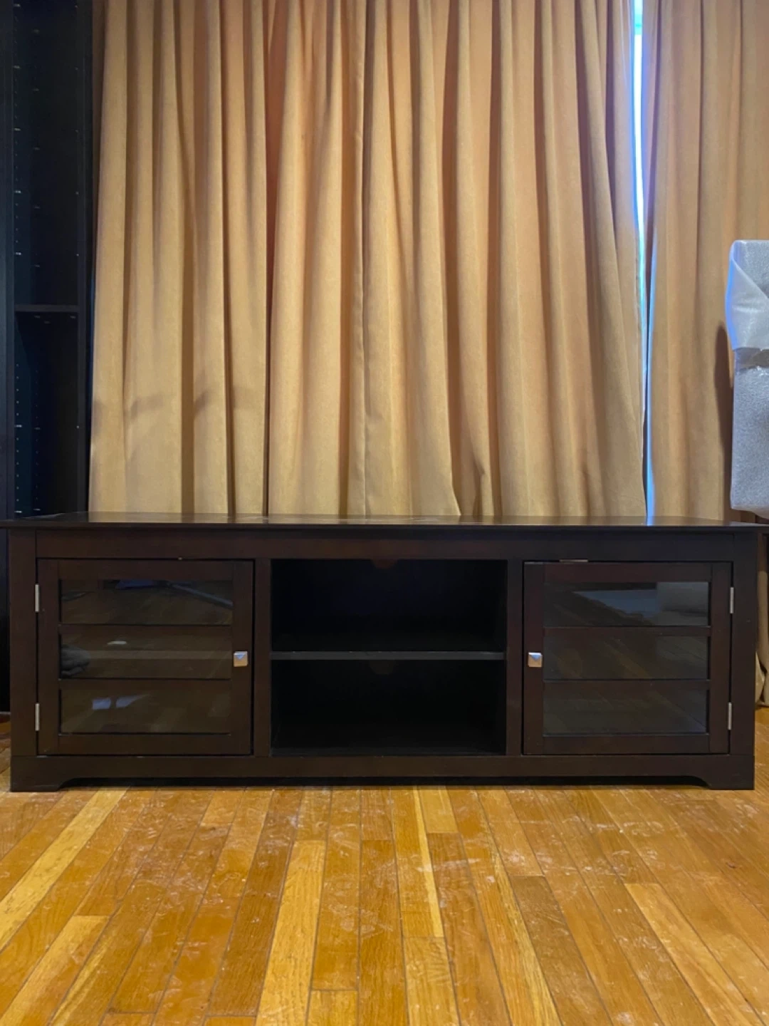 This media console is a rich dark brown colour and features glass-fronted cabinets. It has a central open shelf for electronics. It's great for organizing your entertainment setup. The console offers plenty of storage space!