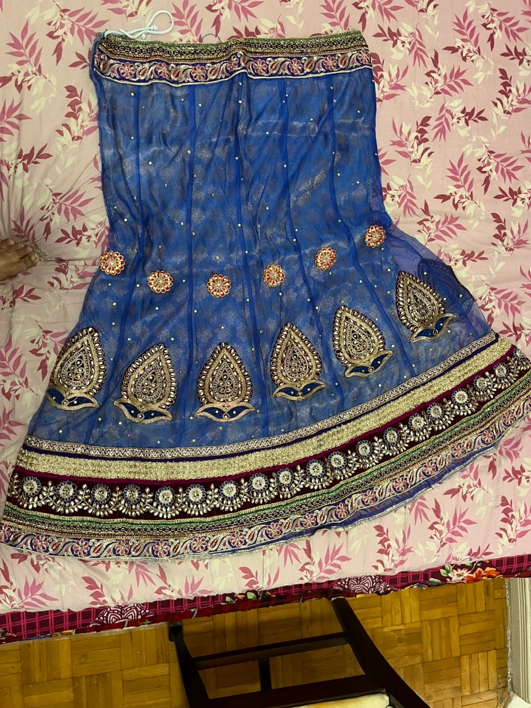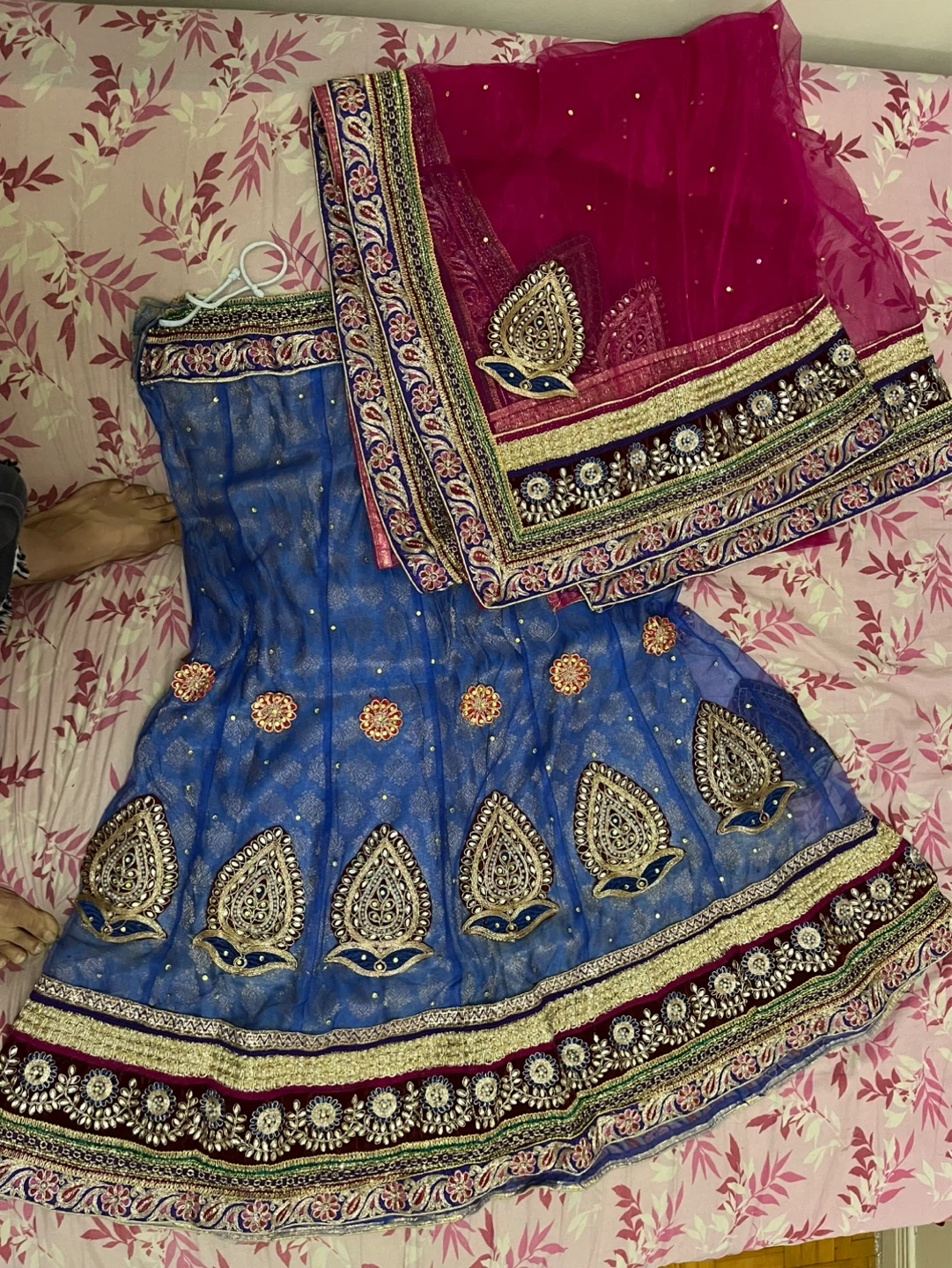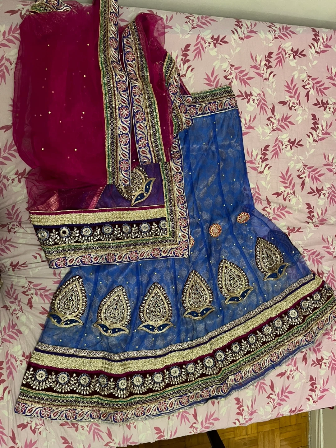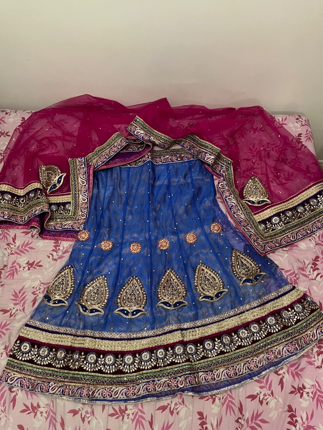 Blue and pink embroidered lehenga choli with dupatta