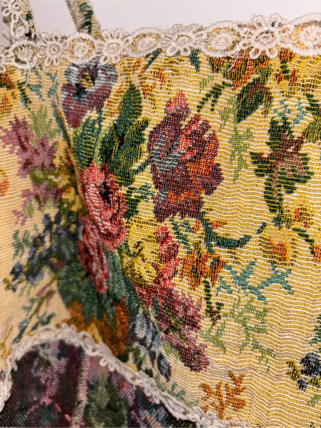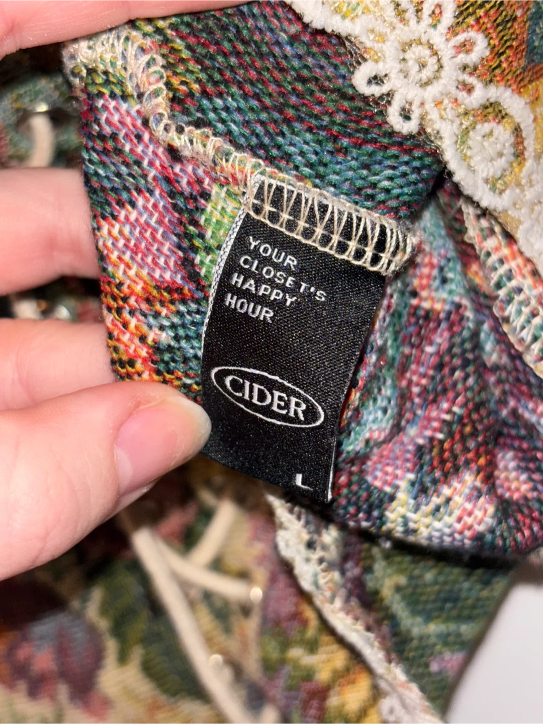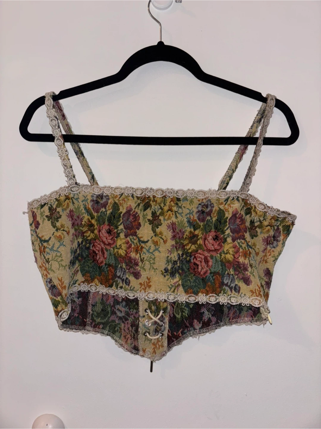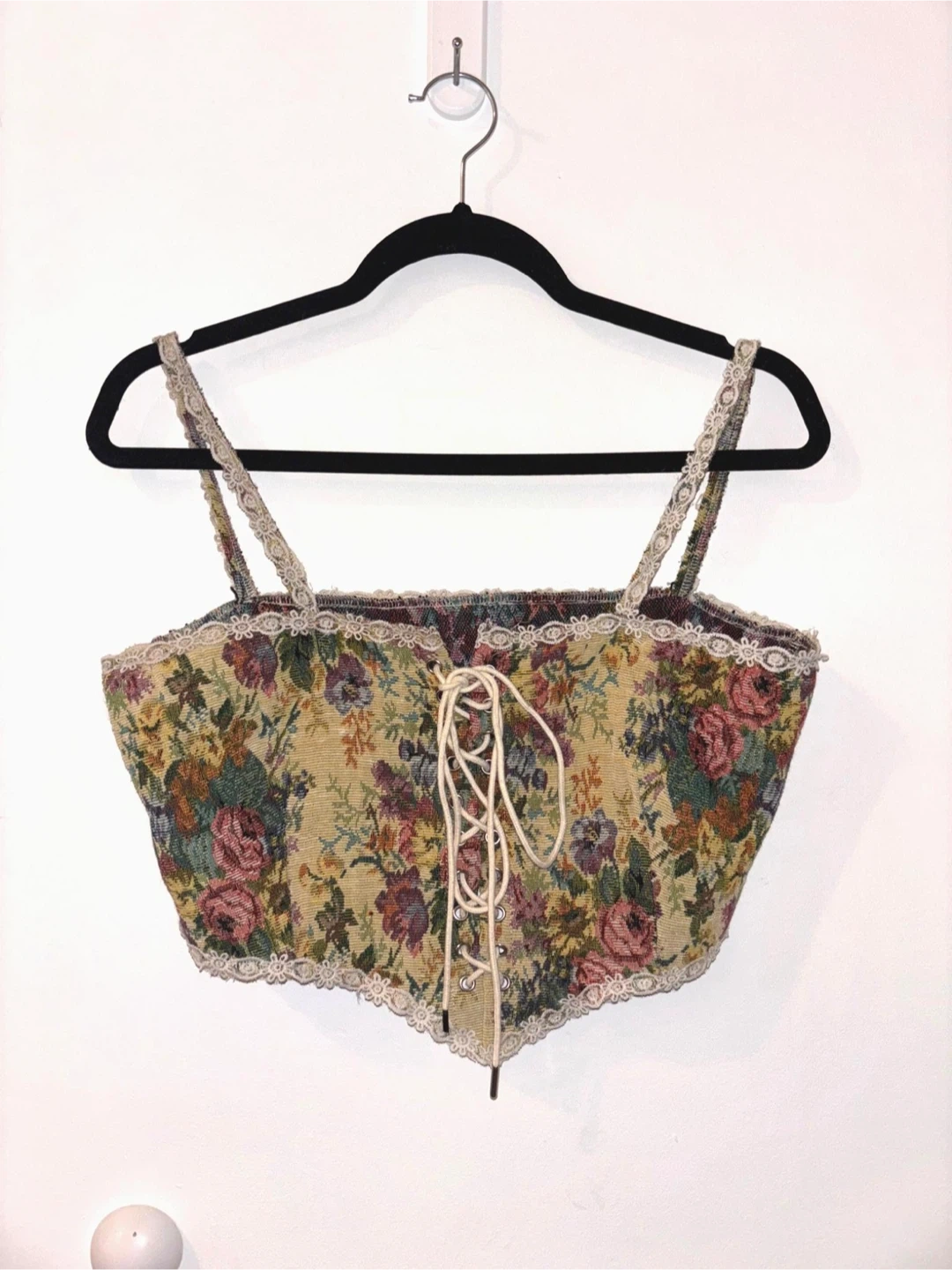 A floral tapestry corset top from Cider. It's a size Large with lace trim and a lace-up front. Great for adding a unique vintage touch to an outfit!
