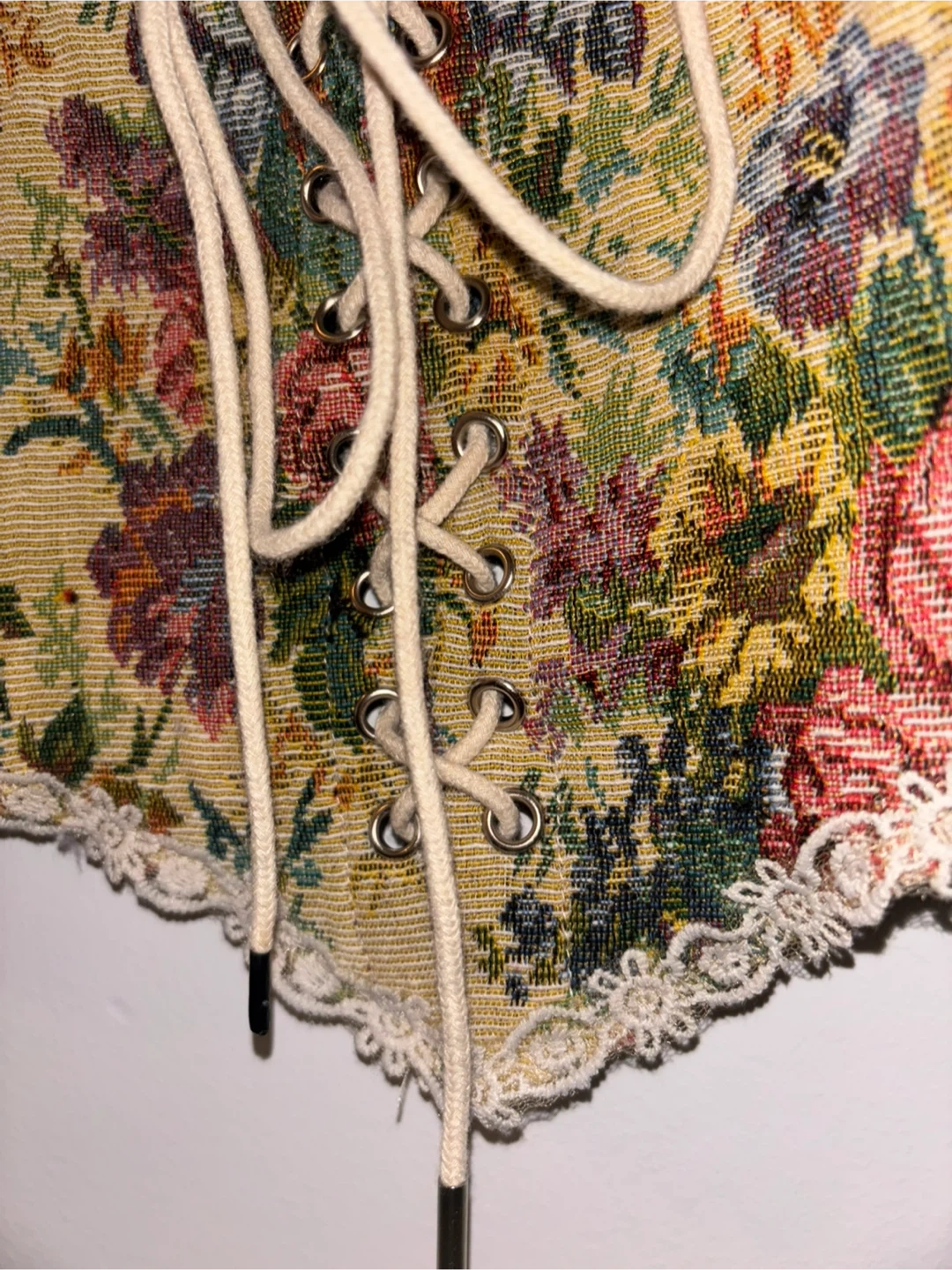 A floral tapestry corset top from Cider. It's a size Large with lace trim and a lace-up front. Great for adding a unique vintage touch to an outfit!