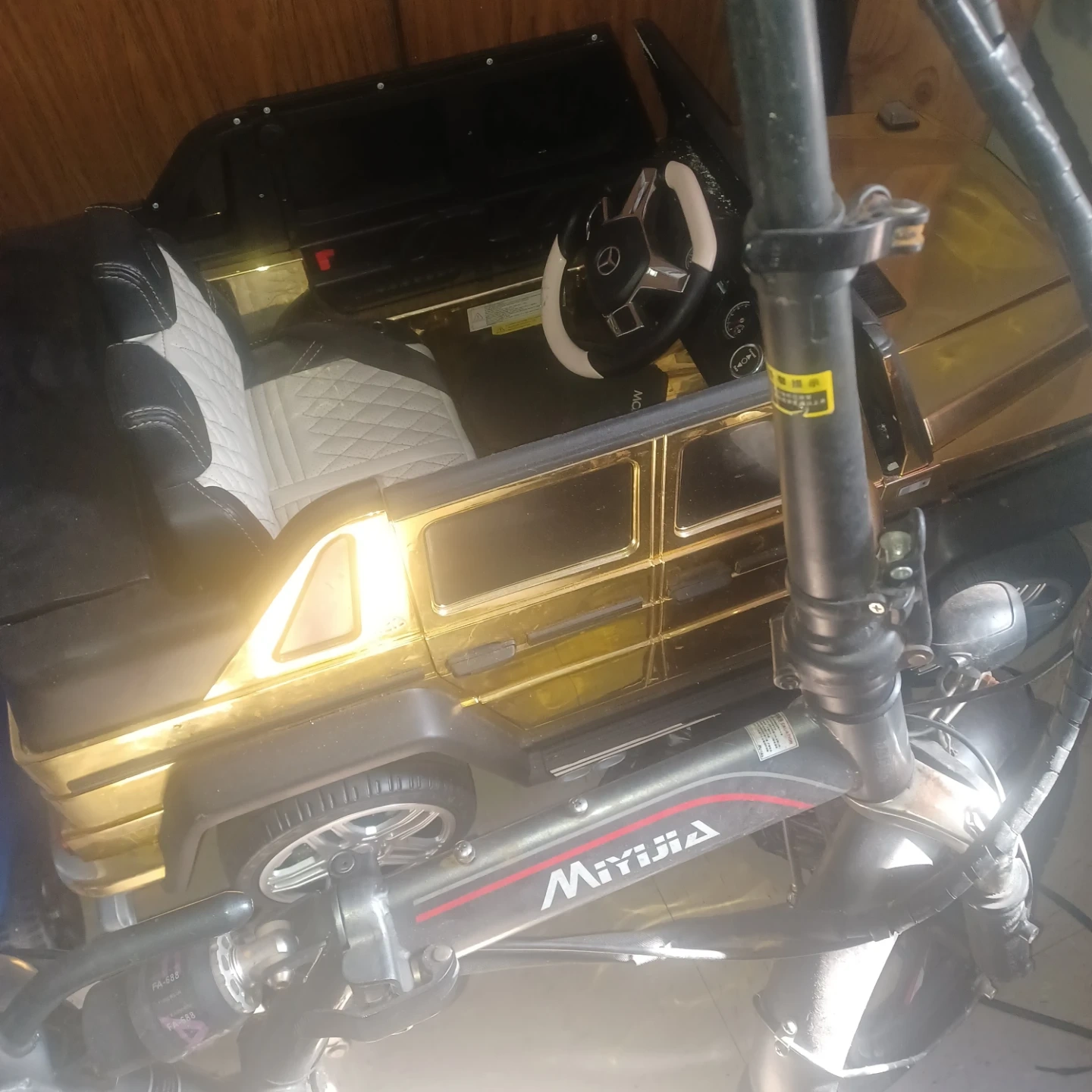 This ride-on car features a sleek gold finish and a comfortable interior. It has a Mercedes-Benz style steering wheel. Great for outdoor playtime!