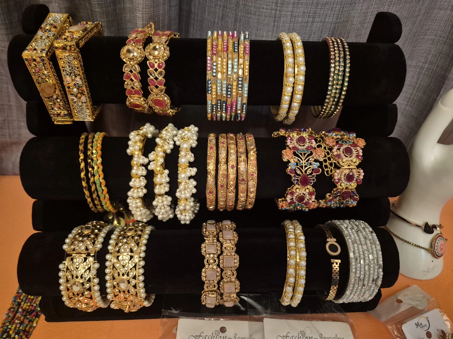 A collection of ornate bangles and bracelets in various styles. Features intricate detailing and colourful embellishments. Perfect for adding a touch of sparkle to any outfit!
