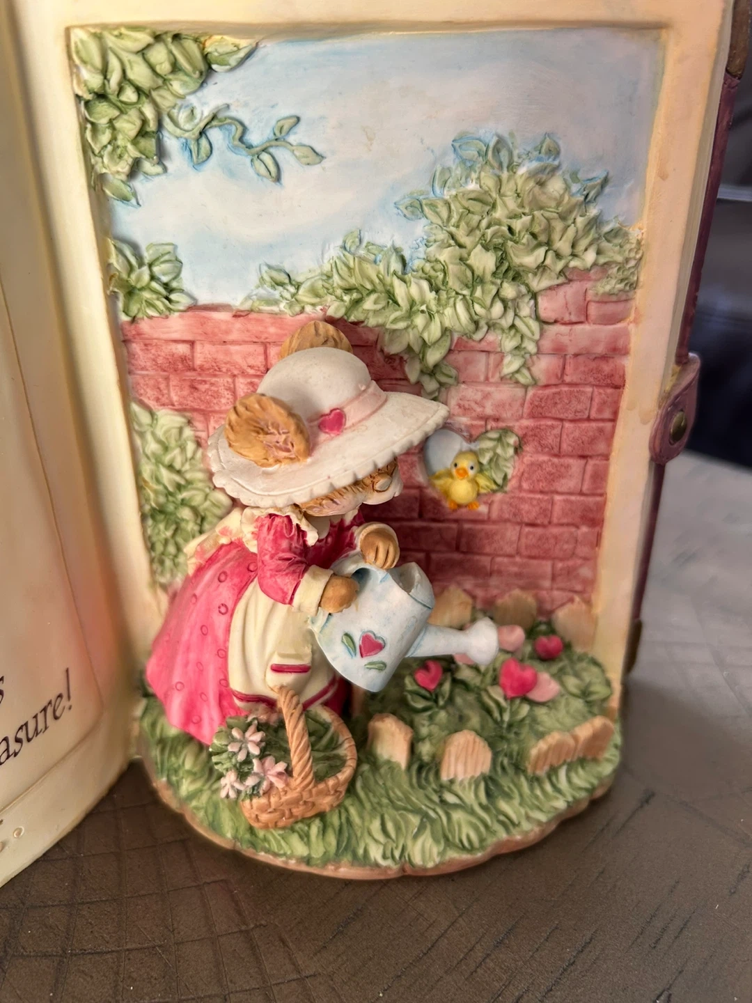 This vintage ceramic decorative item sits open like a book, featuring a heartwarming poem for Grandma. It includes a charming figurine of a rabbit watering flowers. Heavy, solid, unique. Carlton Cards ‘Tiny Talk Collection’ called A Garden of Love. Minor paint wear on some corners. Brampton, near Queen and Kennedy.