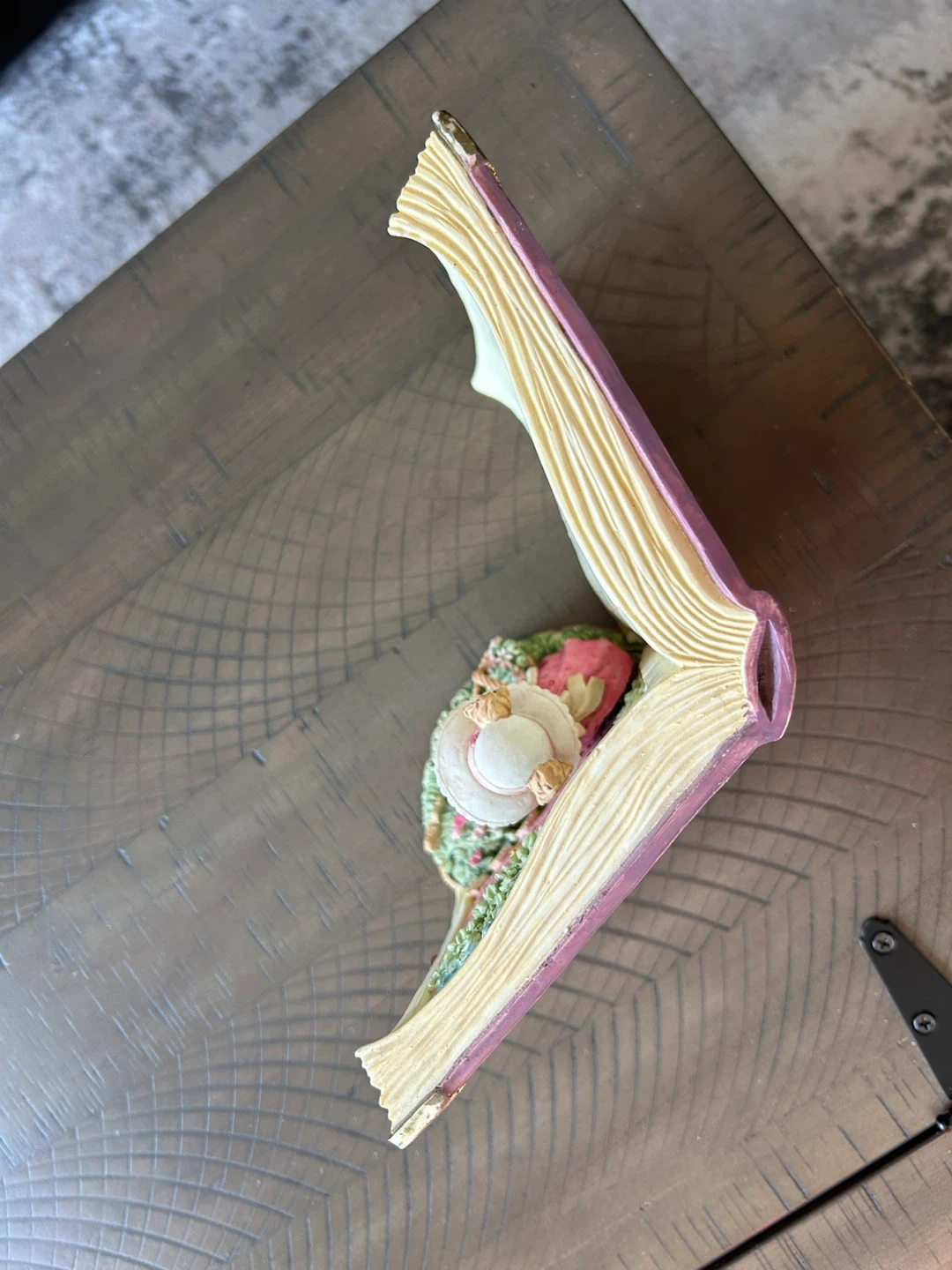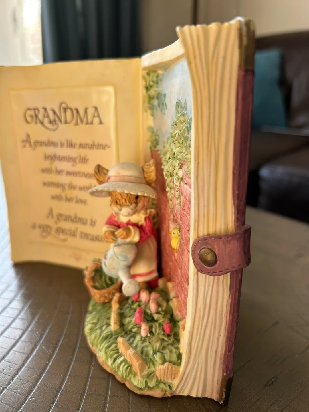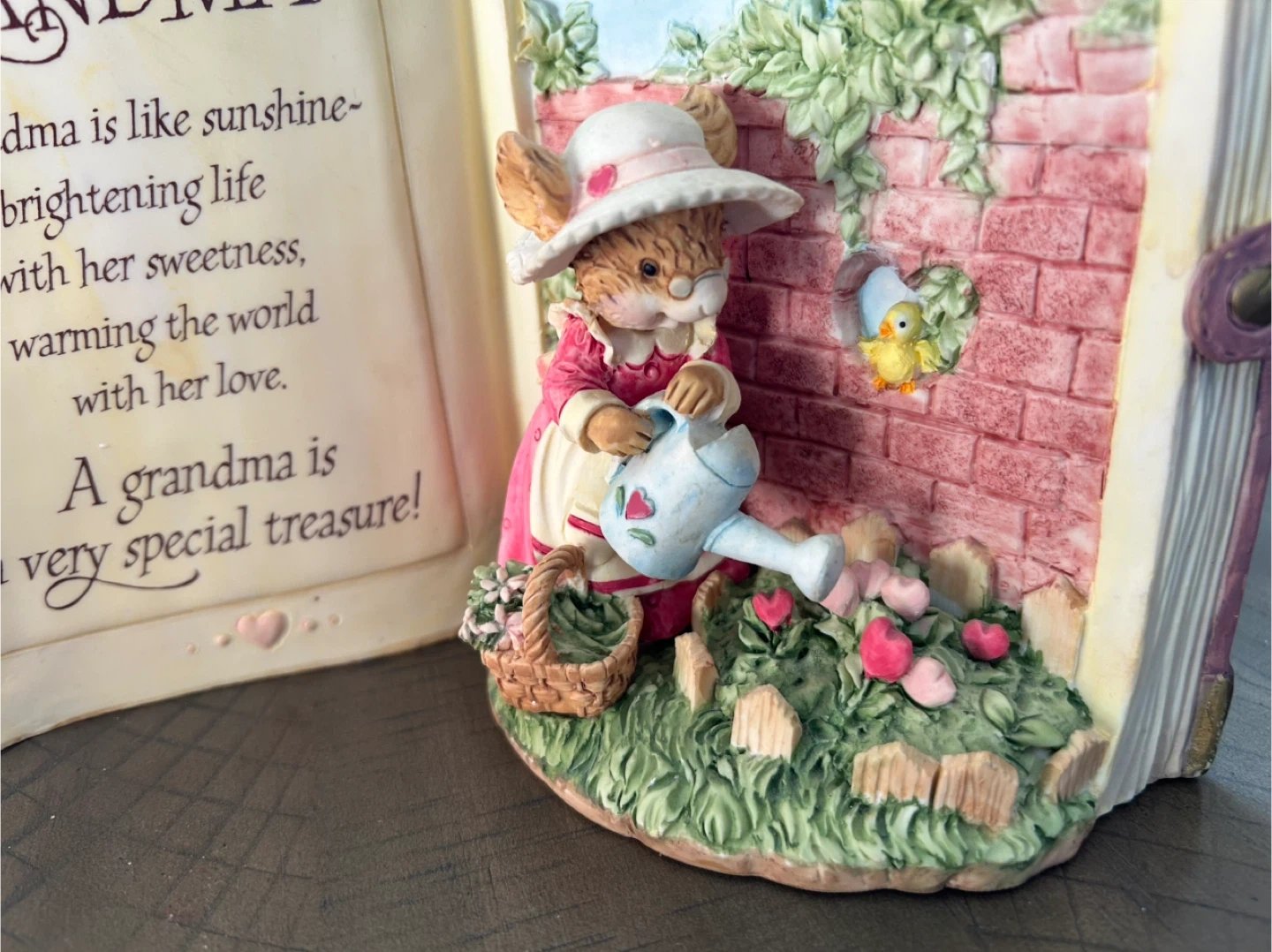 This vintage ceramic decorative item sits open like a book, featuring a heartwarming poem for Grandma. It includes a charming figurine of a rabbit watering flowers. Heavy, solid, unique. Carlton Cards ‘Tiny Talk Collection’ called A Garden of Love. Minor paint wear on some corners. Brampton, near Queen and Kennedy.