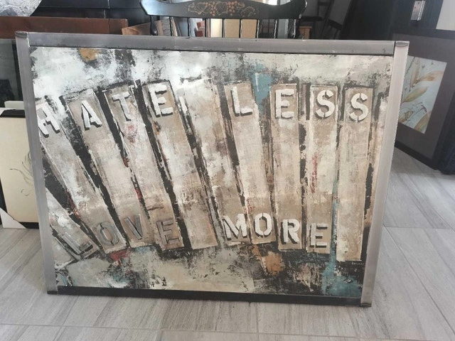 Elevate your space with this captivating piece of art work, featuring the thought-provoking message "Hate Less, Love More". This statement piece adds a touch of inspiration and style to any room. The artwork is in good condition, ready to become a focal point in your home or office. Metal art embossed word: LOVE. If the ad is still up, it's available! PU near chinook