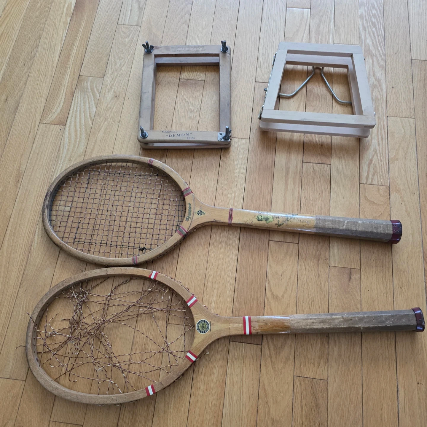 Two wooden tennis rackets, one branded "JUNIOR". Includes two stringing clamps. These are vintage items, perfect for display or for a collector.