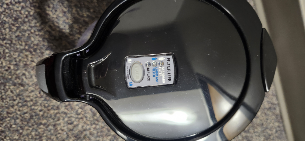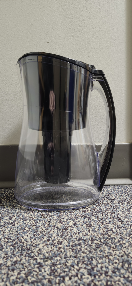 Water filter pitcher. Clear plastic body, black lid and handle. Filter replacement indicator.