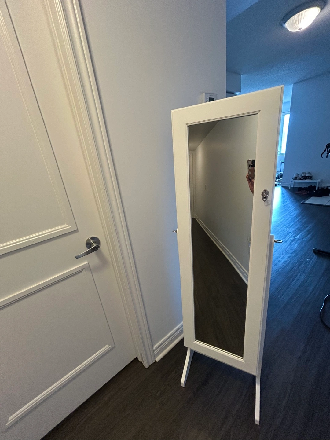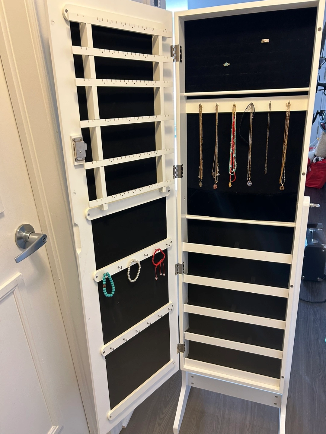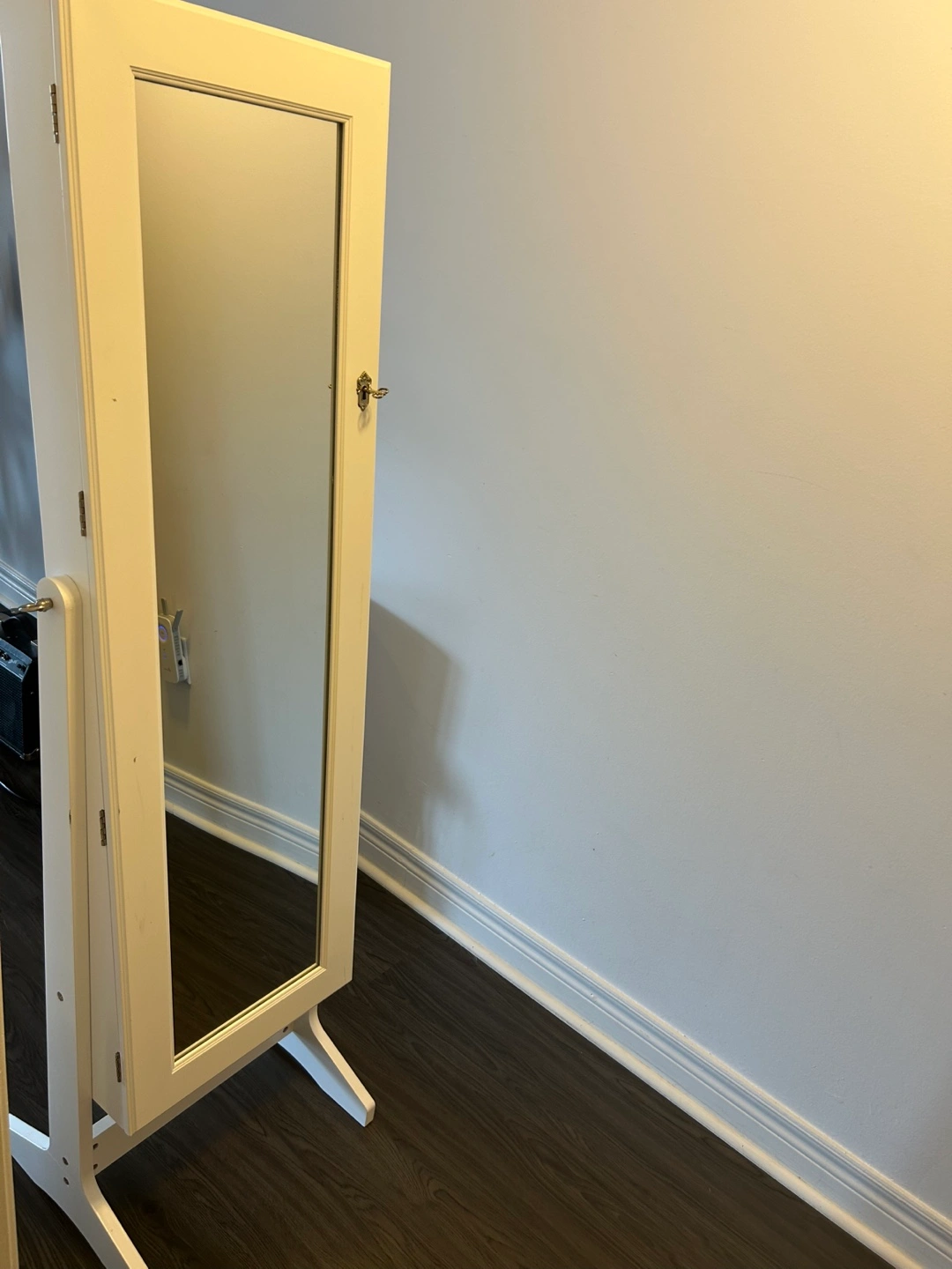 Here's a lovely white freestanding mirrored jewelry armoire! It's perfect for keeping all your necklaces, bracelets, and earrings organized and tangle-free. It also has a lock and key to keep your valuables safe and sound.