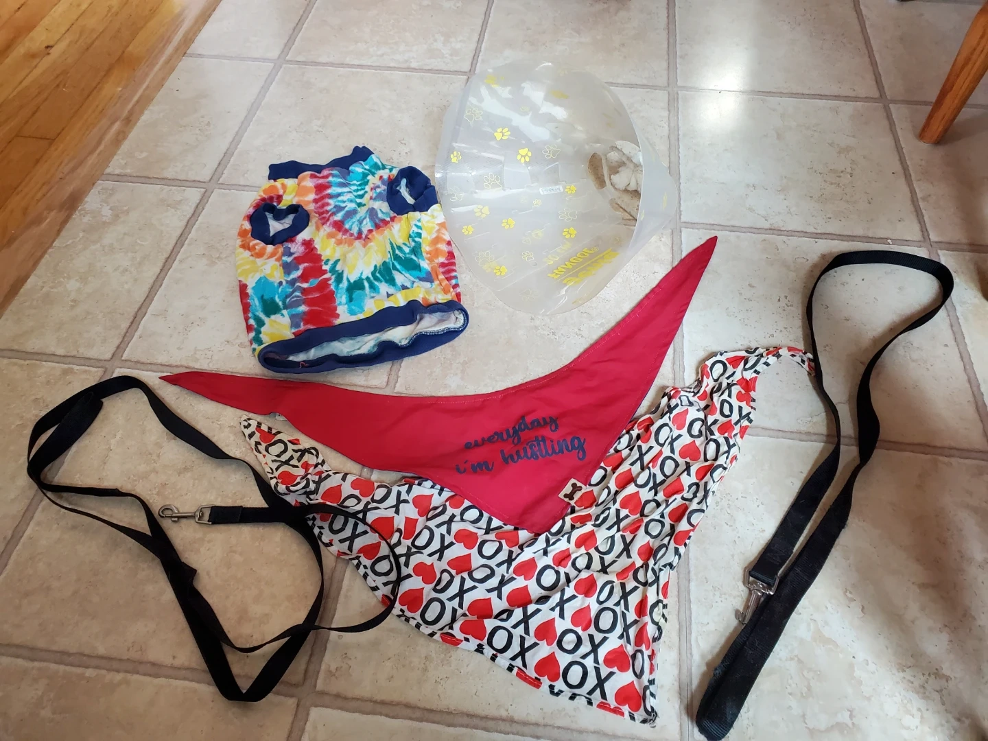 Tie-dye dog shirt with heart cutouts and navy trim. Includes a red bandana with "everyday hustling" embroidery, and a white bandana with an "XOXO" print. Also comes with a black nylon leash and a clear Elizabethan collar. Great for a stylish pup!