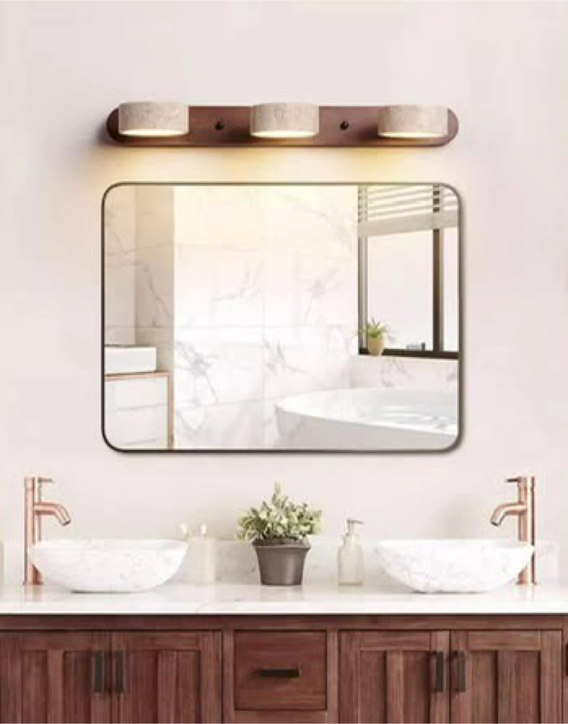 This vanity light features a natural wood base with three cylindrical shades made of textured stone-like material. The lamp heads can be rotated 180 degrees for adjustable lighting. It's a stylish and functional addition to any bathroom.
