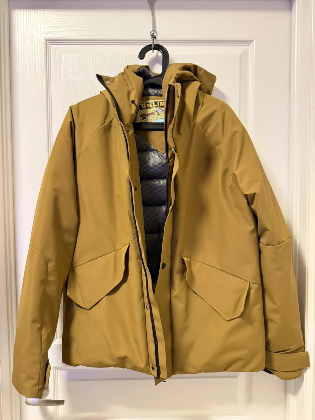 This Togs Unlimited down jacket is a warm outdoor garment. It's made in China. The size is XL/TG. It's great for staying toasty in cooler weather!