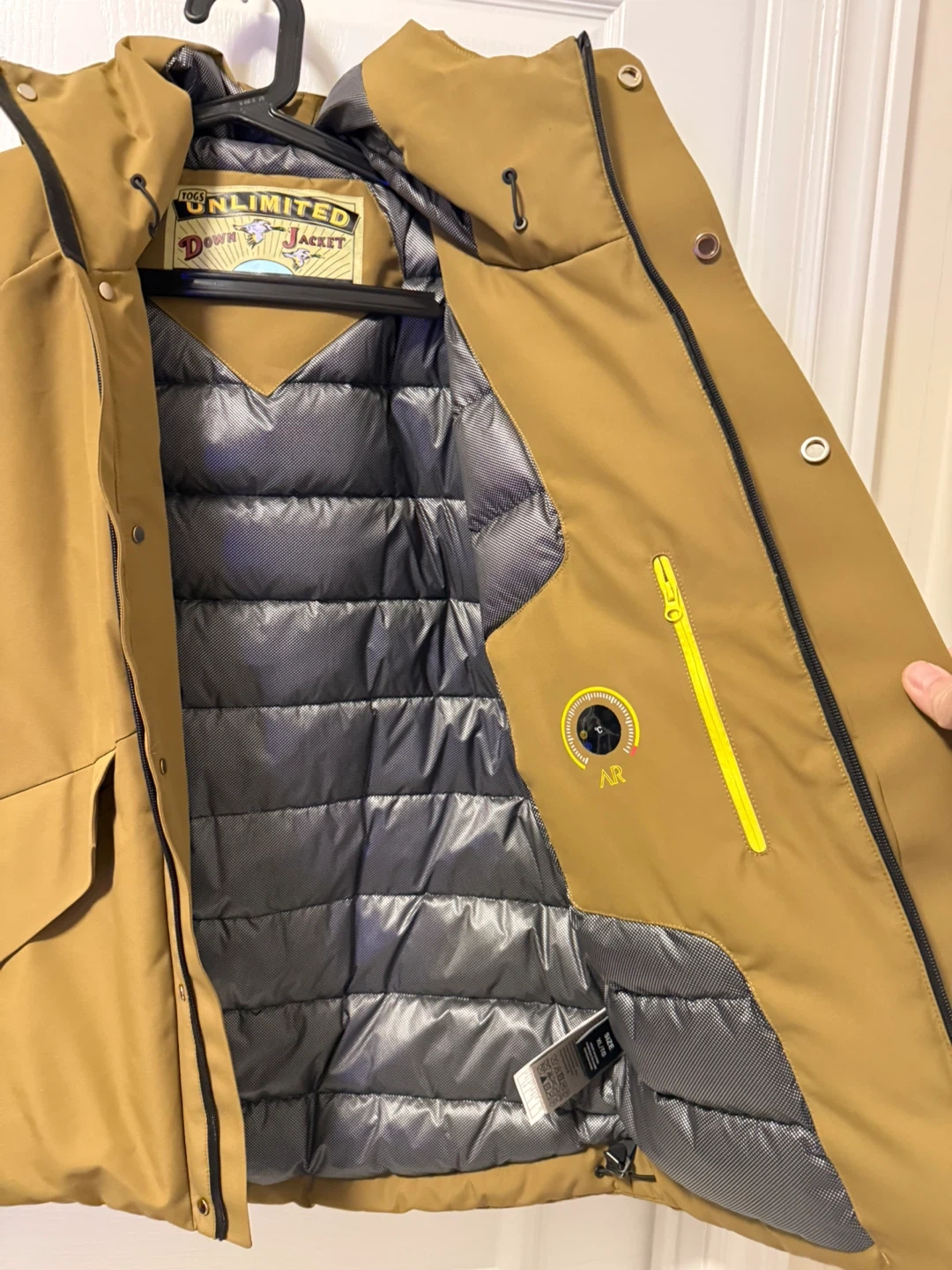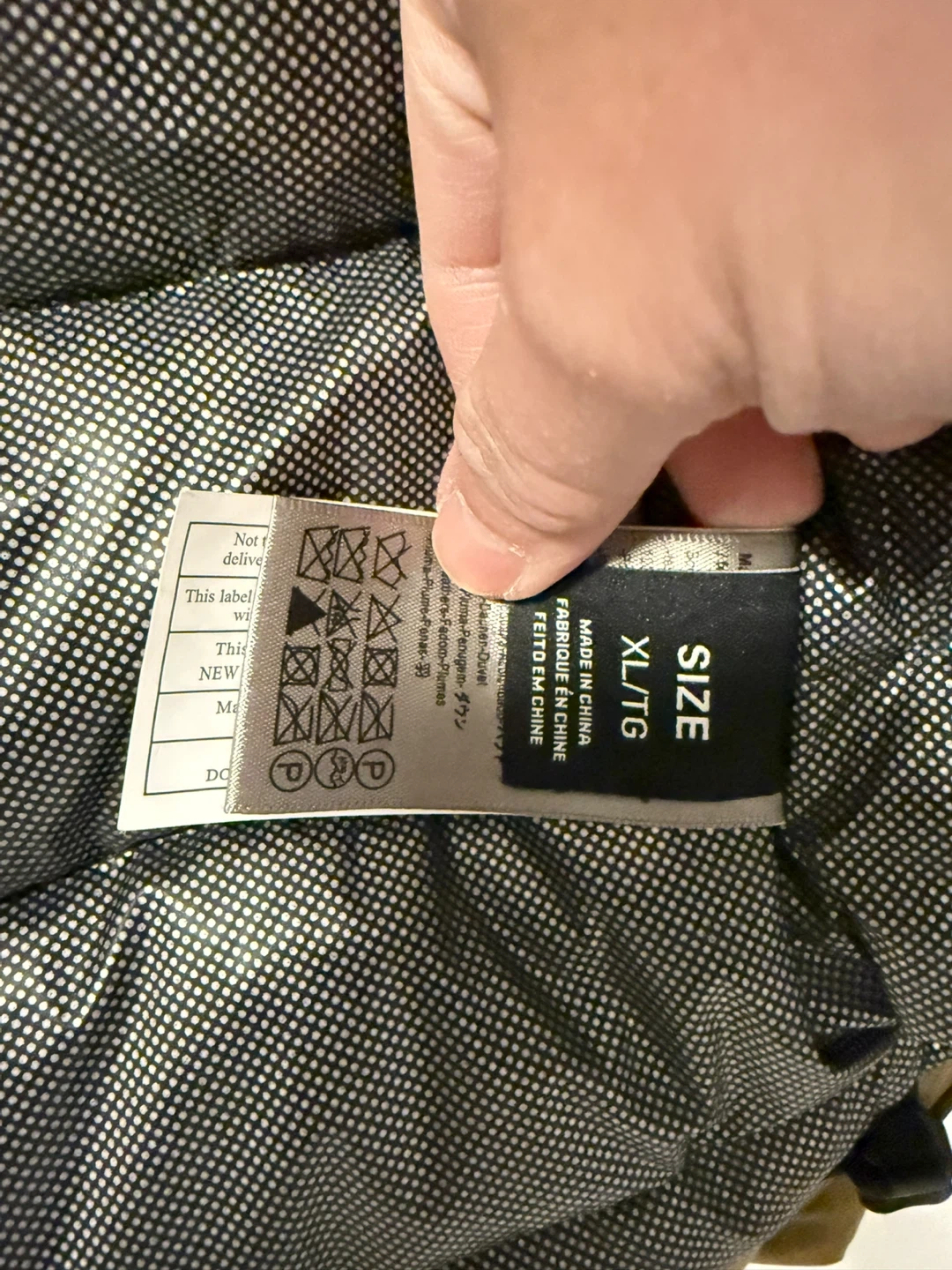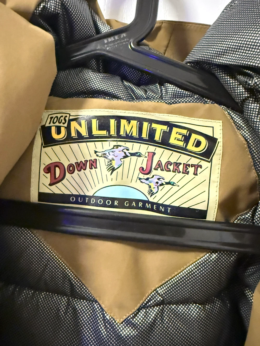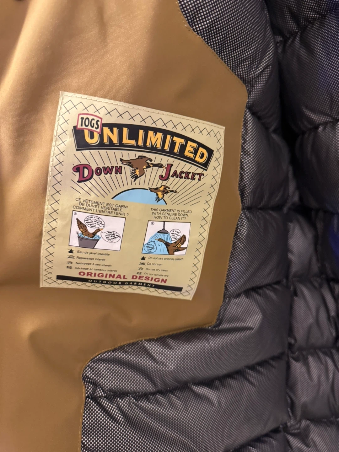 This Togs Unlimited down jacket is a warm outdoor garment. It's made in China. The size is XL/TG. It's great for staying toasty in cooler weather!