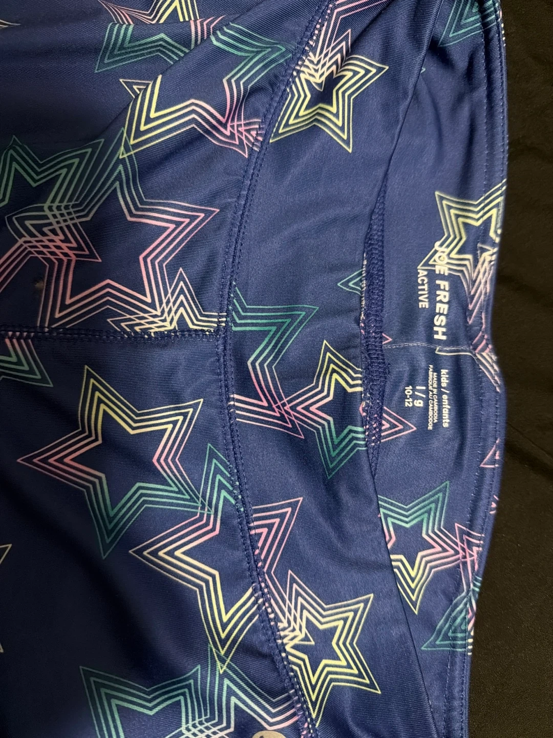 These Justice Active leggings come in a fun navy blue with a colourful star pattern. They're made from a polyester and spandex blend for comfort. Size is 10-12.