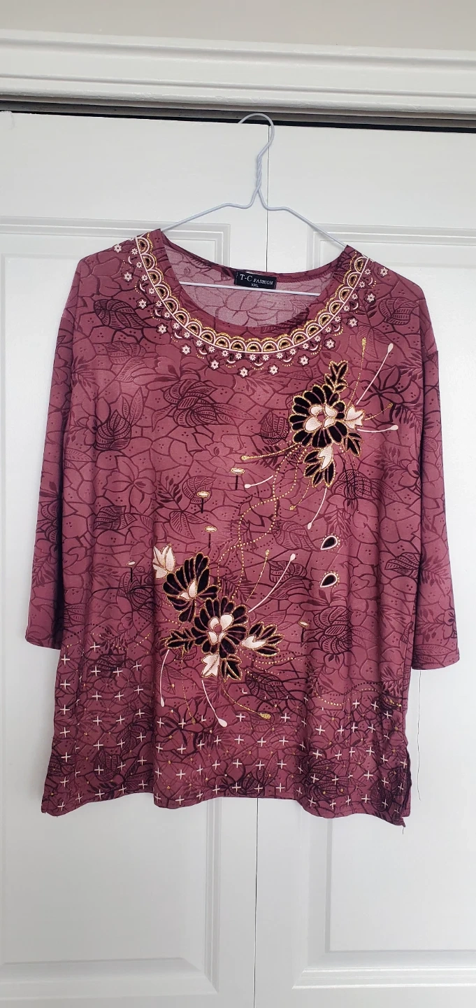 This T-C Fashion top features a beautiful floral print and decorative neckline. It's a size XXL.