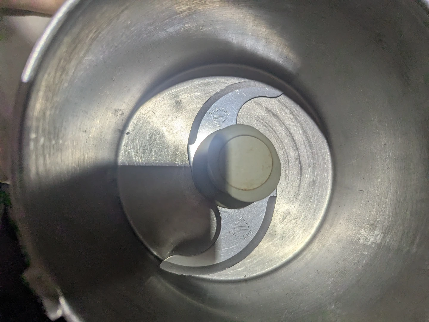This is a Robot Coupe R 401 food processor. It has a 4-quart capacity and includes the standard blade. Great for chopping and puréeing ingredients quickly!