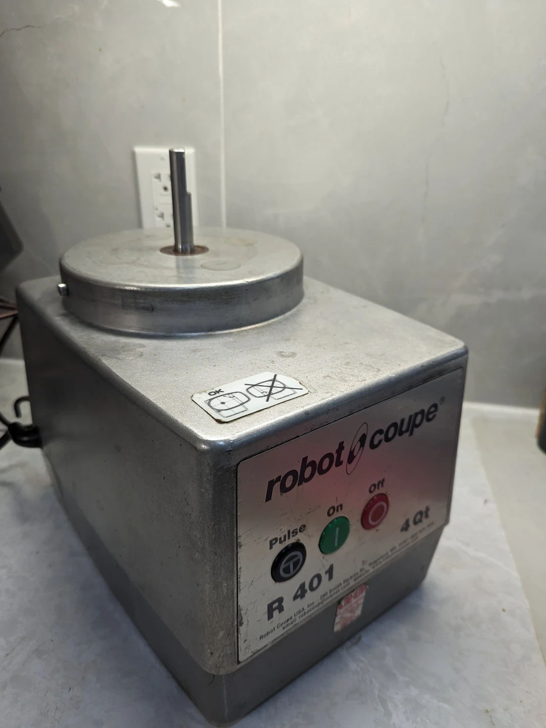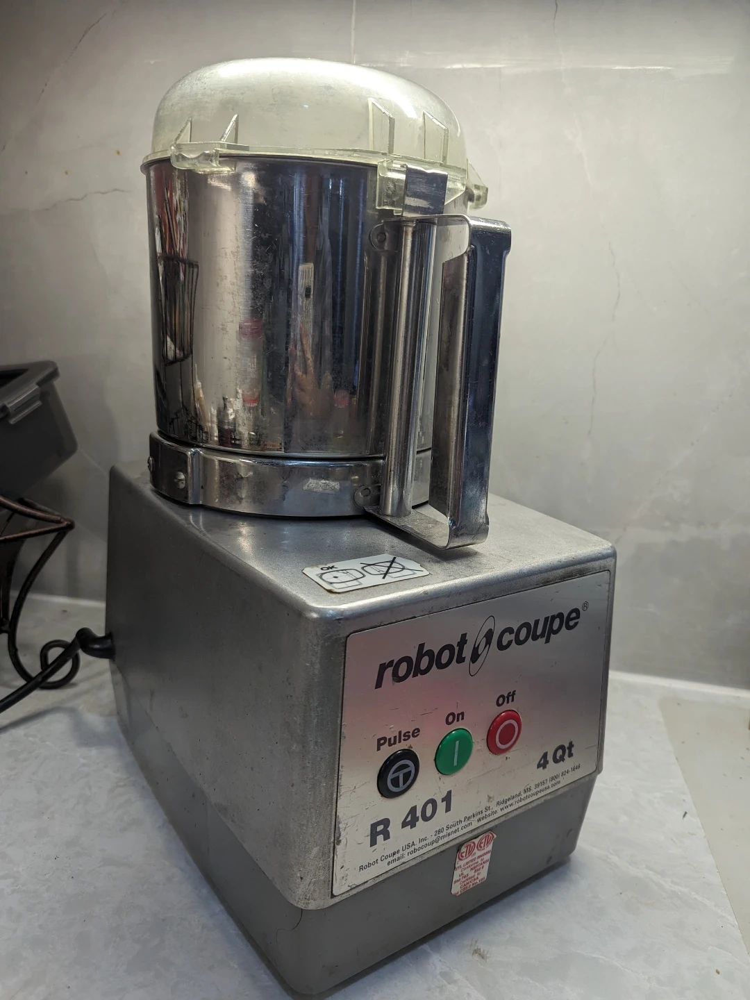 This is a Robot Coupe R 401 food processor. It has a 4-quart capacity and includes the standard blade. Great for chopping and puréeing ingredients quickly!