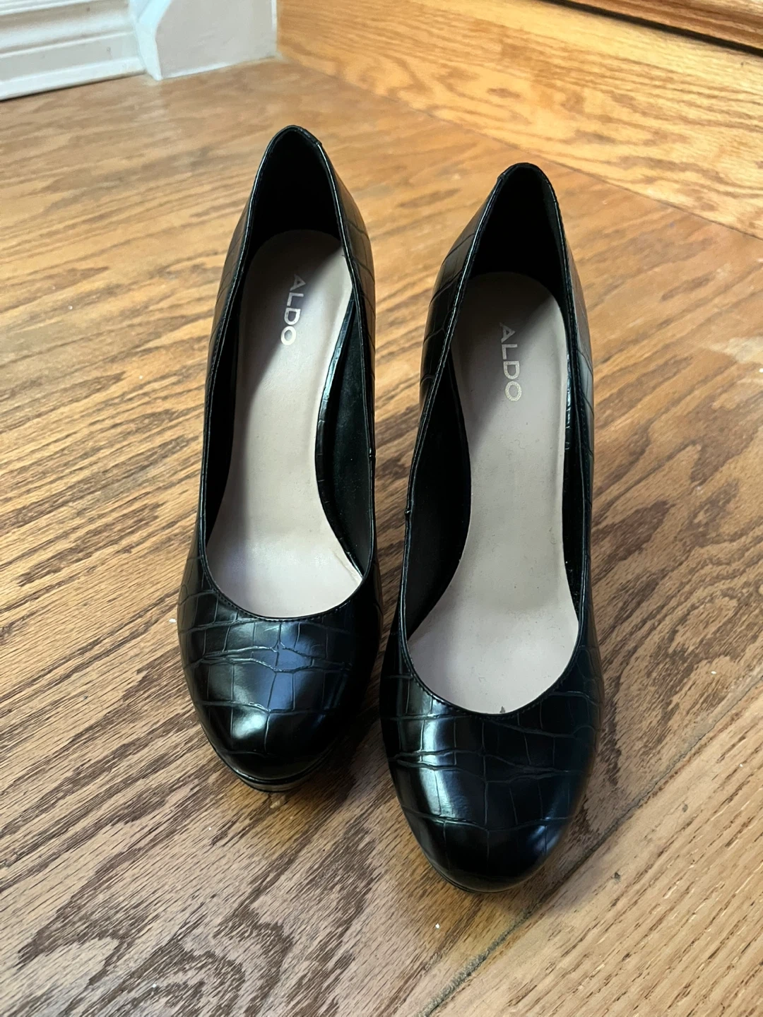 Classic ALDO black 4” heels with a croc-embossed finish. These platform heels have a stacked block heel and are made from a glossy synthetic material. They're perfect for adding a touch of elegance to any outfit!