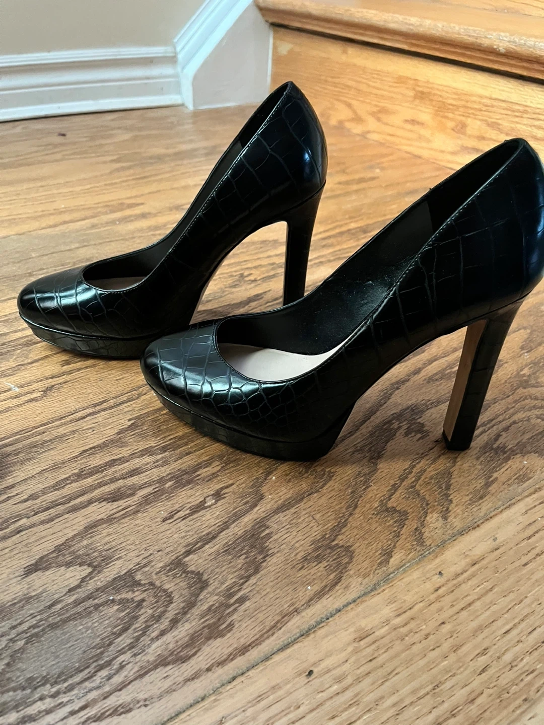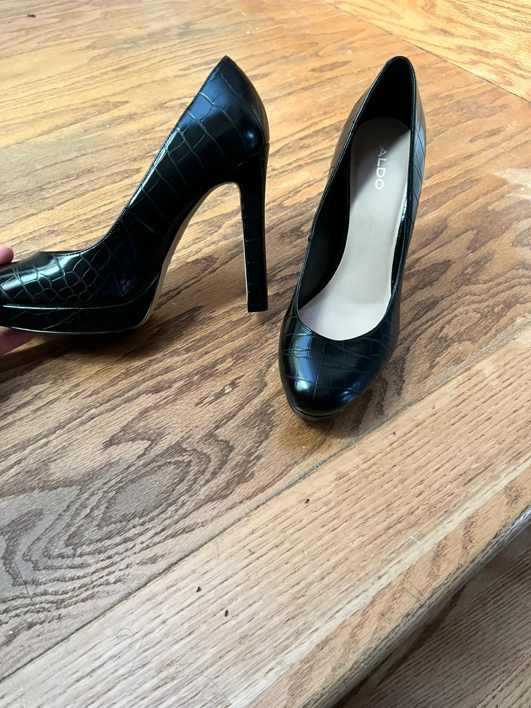 Classic ALDO black 4” heels with a croc-embossed finish. These platform heels have a stacked block heel and are made from a glossy synthetic material. They're perfect for adding a touch of elegance to any outfit!