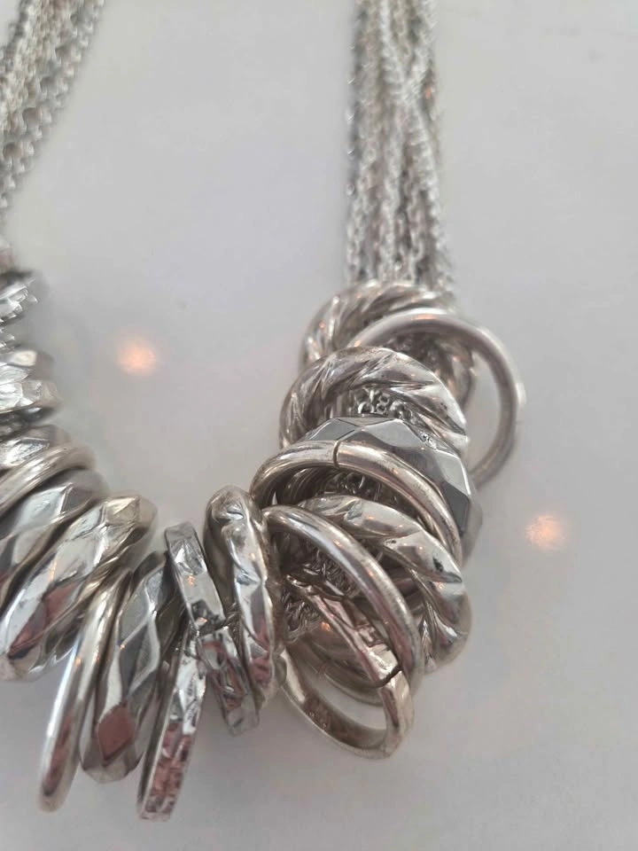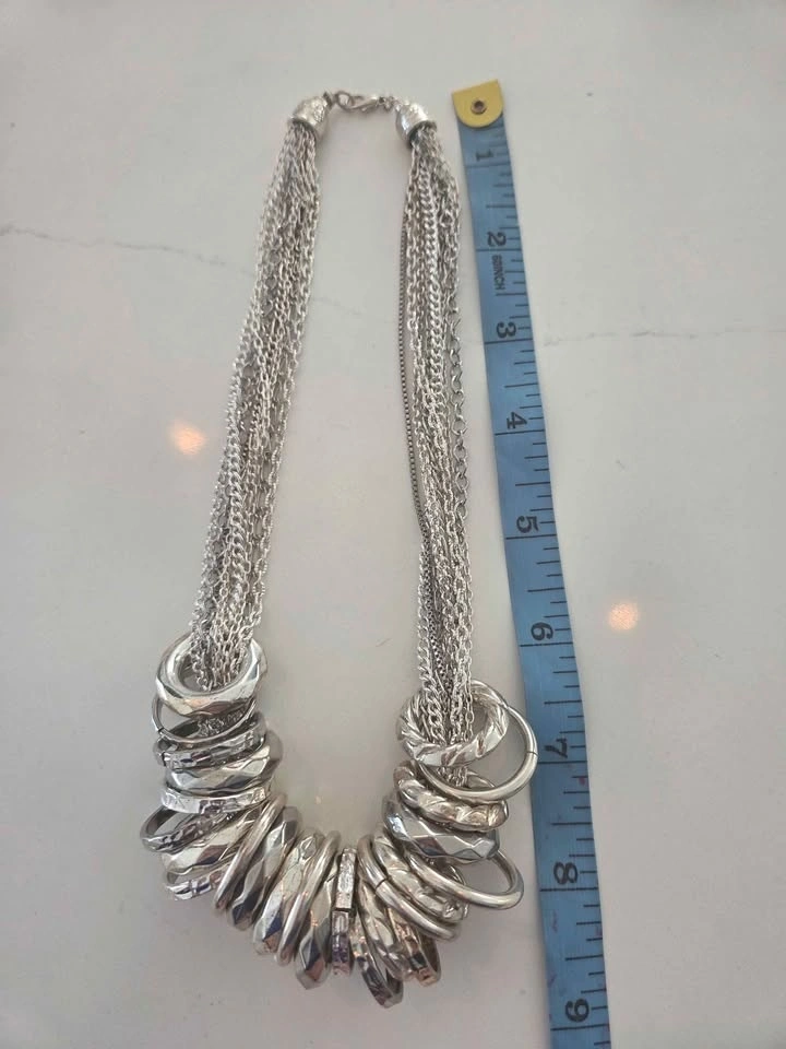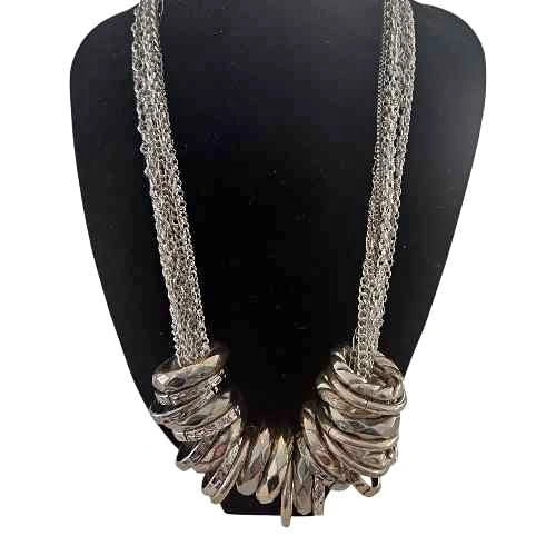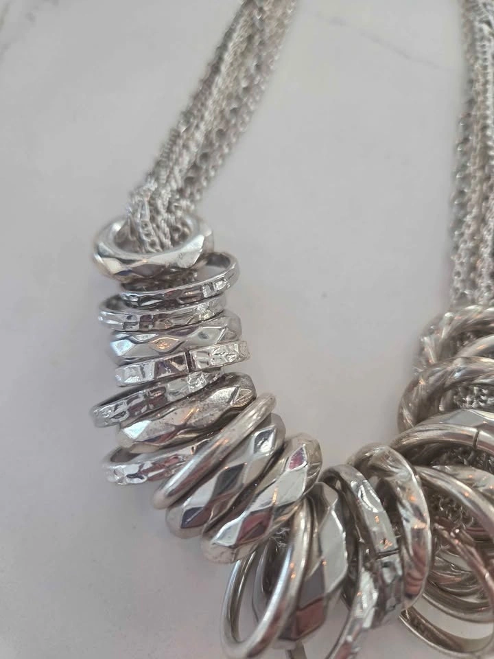 Stylish silver tone multi-chain necklace with chunky stacked ring accents. A bold statement piece that instantly elevates any outfit. Great for evenings out, special events, or adding edge to a simple look. Pre-owned in excellent condition. Pickup in Oshawa near Ritson and Hillcroft