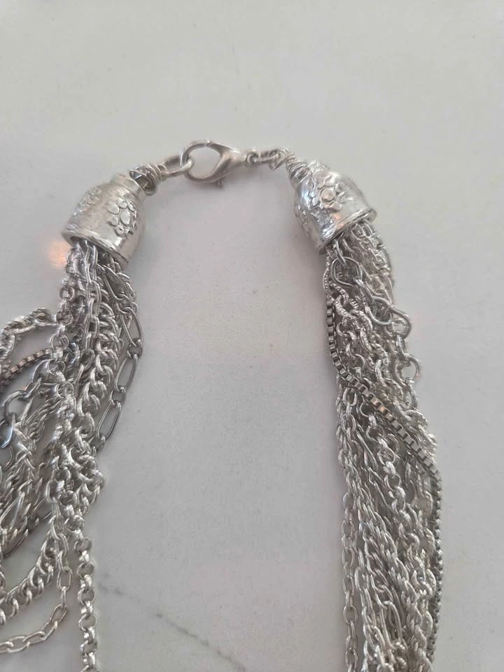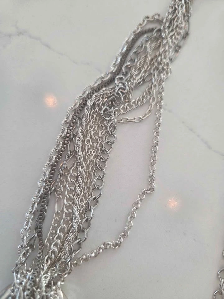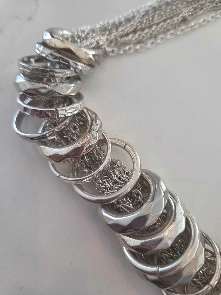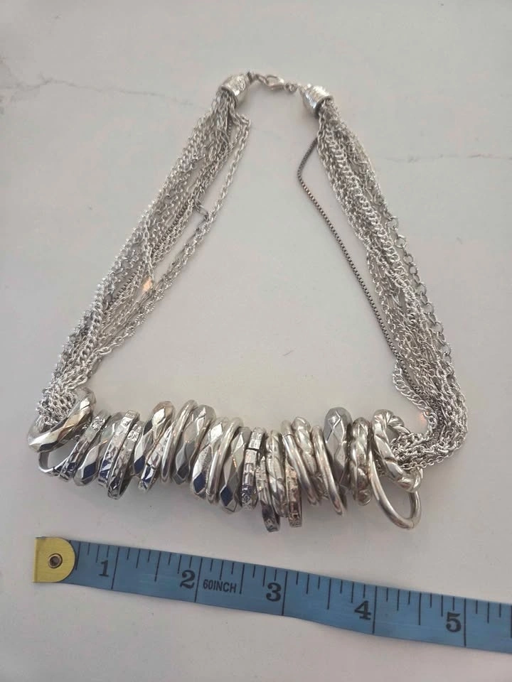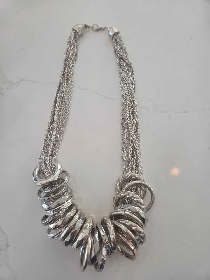 Stylish silver tone multi-chain necklace with chunky stacked ring accents. A bold statement piece that instantly elevates any outfit. Great for evenings out, special events, or adding edge to a simple look. Pre-owned in excellent condition. Pickup in Oshawa near Ritson and Hillcroft