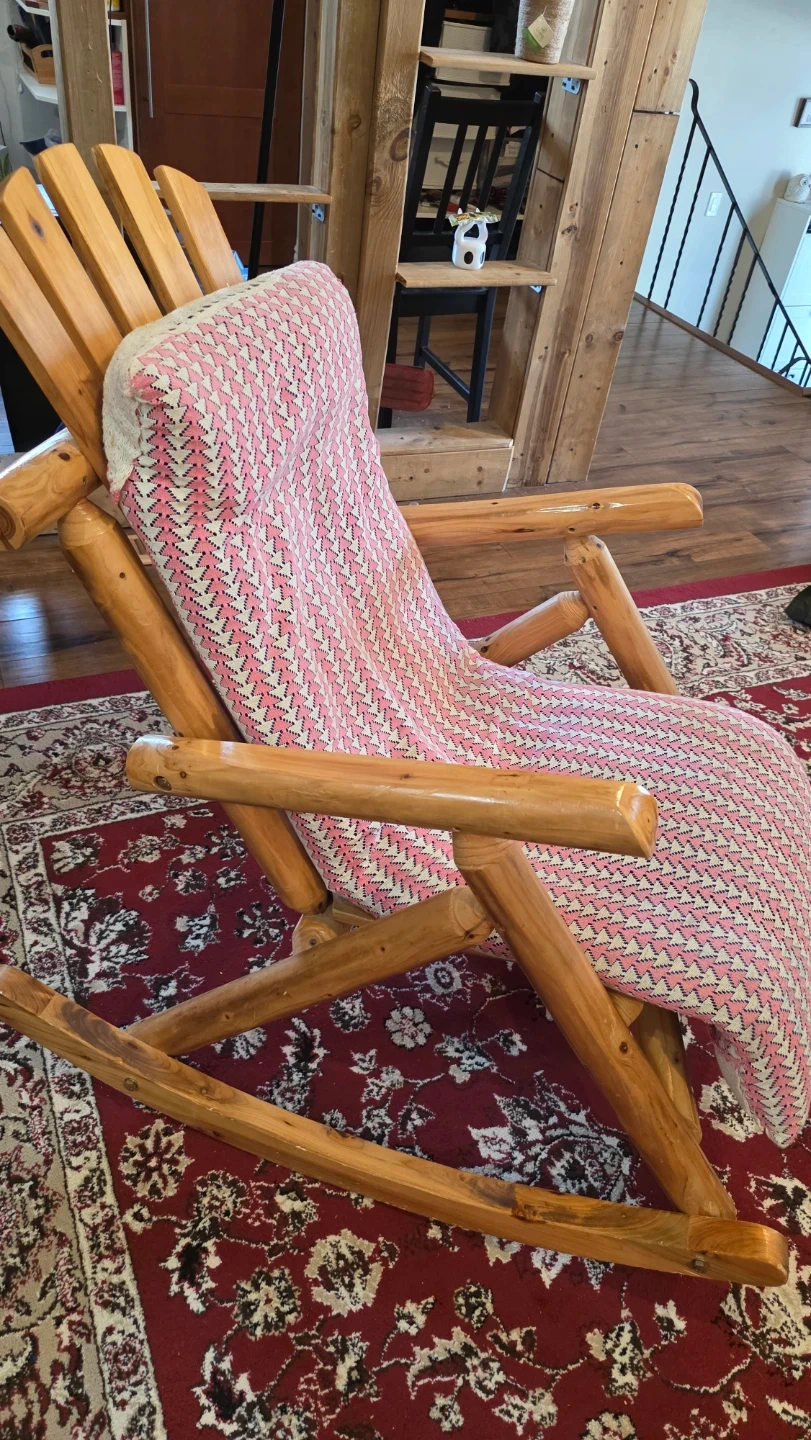 This is a rustic log rocking chair with a comfortable pink and white geometric patterned throw blanket. It's made from solid wood logs. A great addition to any living room or porch!