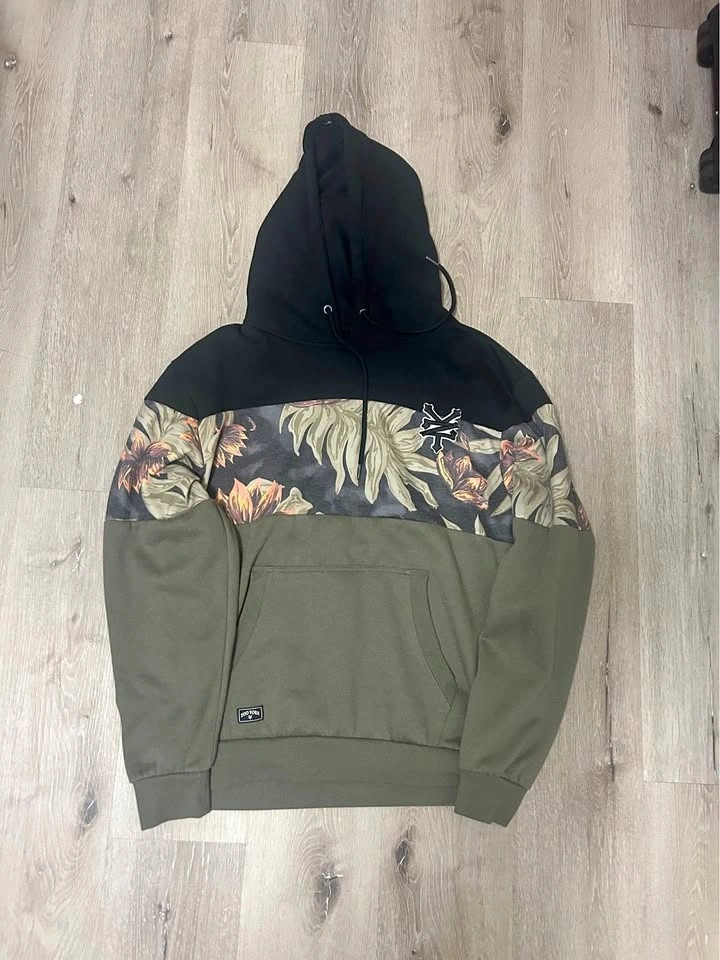 Stylish Zoo York hoodie. Size L/G. Has a black hood and olive green body. Cool tropical floral pattern across the chest. Super comfy for everyday wear.