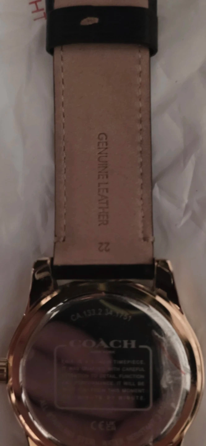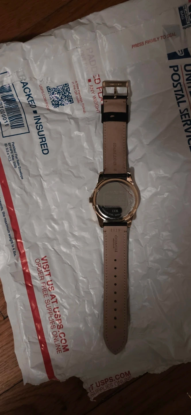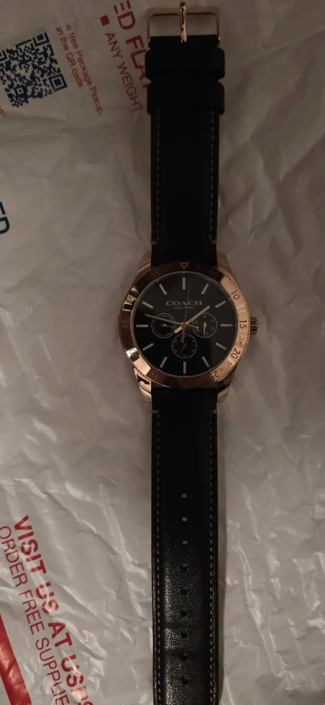 COACH New York timepiece with a rose gold tone case. Features a black dial and genuine leather band. Water resistant. Needs a new battery