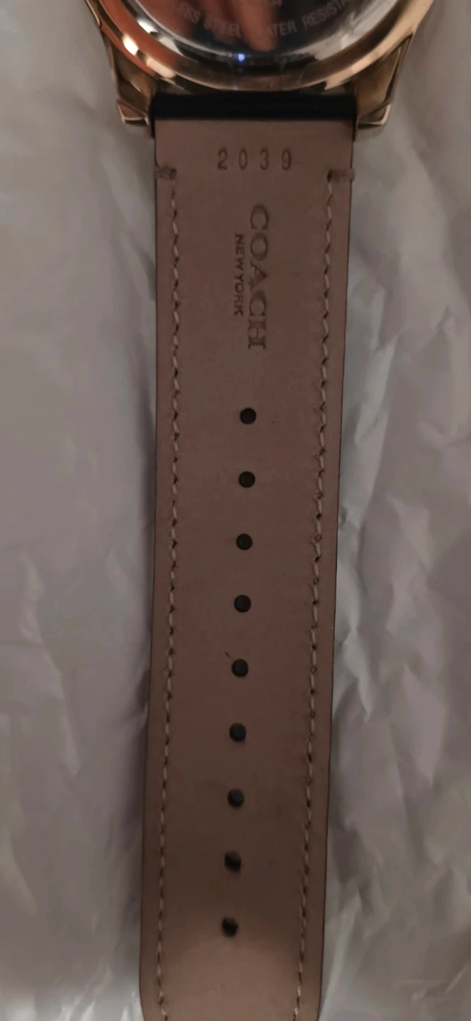 COACH New York timepiece with a rose gold tone case. Features a black dial and genuine leather band. Water resistant. Needs a new battery