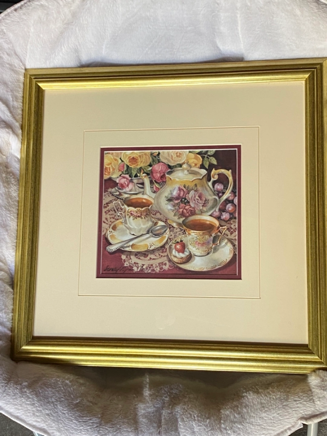 Lovely framed art print by Sandy Lynn Clough. Features a charming tea set and floral design. Ready to hang and add a touch of elegance to your home!