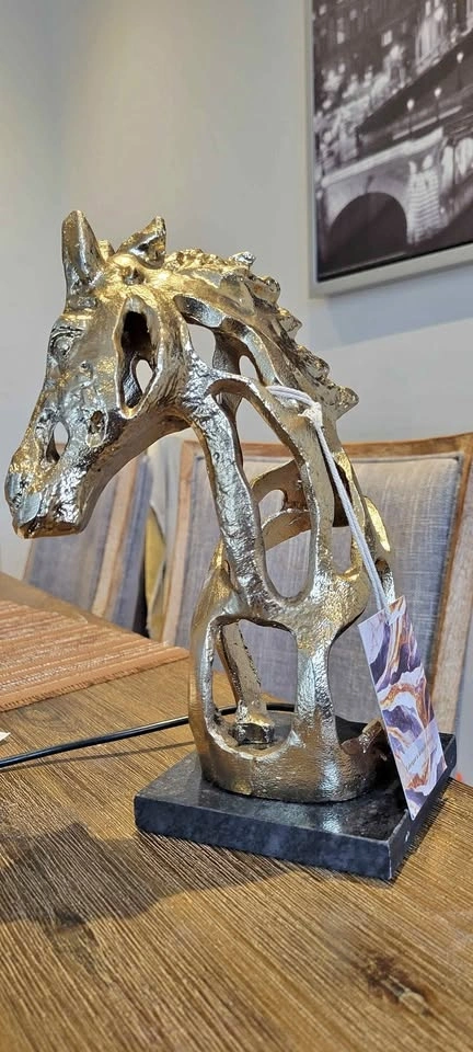 Elevate your decor with this stunning abstract horse sculpture in a beautiful gold finish. Condition: Excellent, like new. Material: High-quality polyresin or aluminum with a polished gold finish. Dimensions: Approximately 10 inches (height) x 5 inches (width) x 4 inches (depth). Design: Features a unique, hollow spiral design and sits on a solid black base, offering a contemporary art deco style. This eye-catching piece is perfect for a desk, bookshelf, or as an elegant accent in any room. Local pickup available in Oakville. Cash or e-transfer preferred.