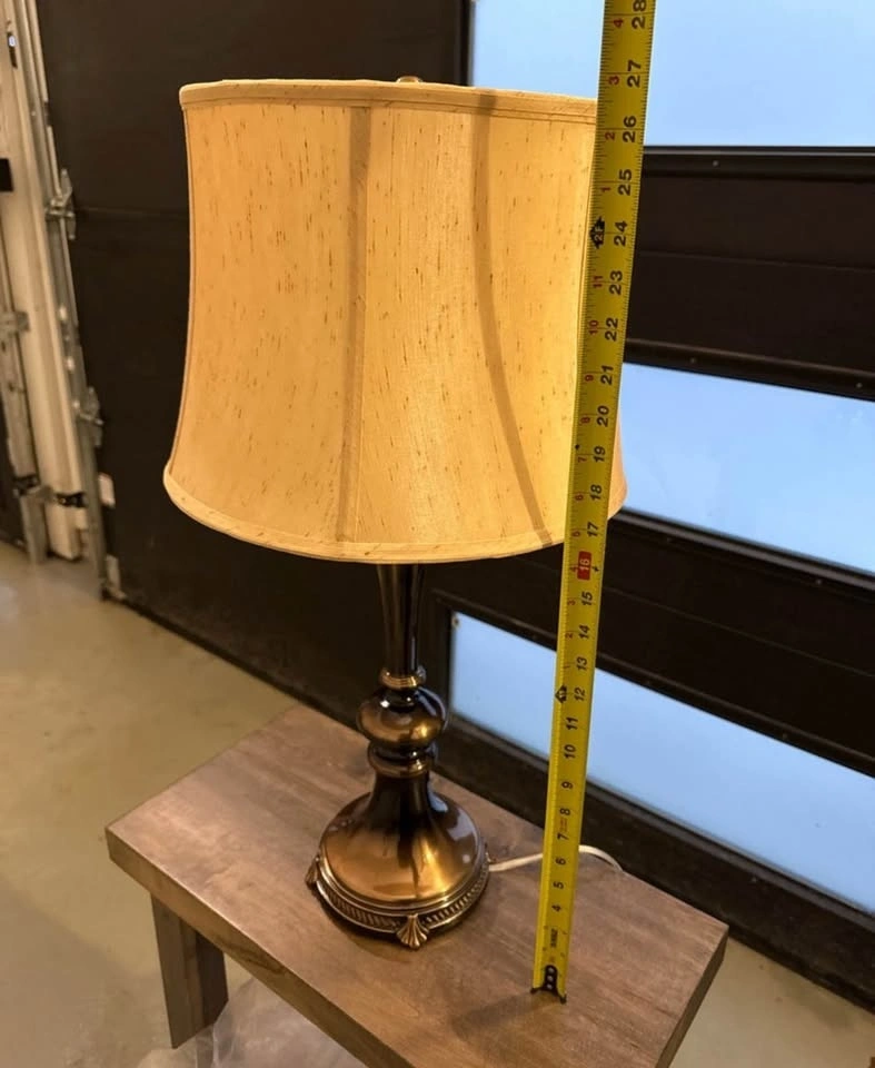 Add a touch of elegance to any room with this table lamp, featuring a bronze-tone base and classic lampshade. It stands approximately 27 inches tall and provides a warm, ambient light.