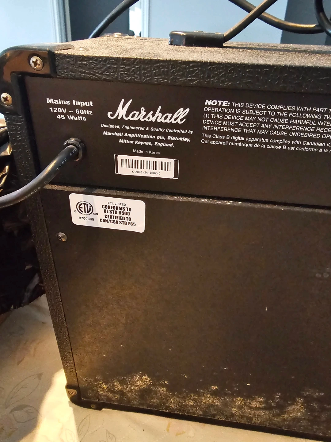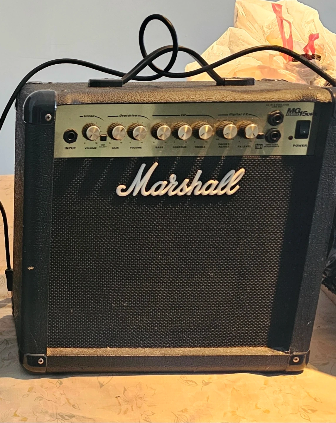 Marshall MG15FX 15 Watt guitar combo amplifier. It's designed, engineered, and quality controlled by Marshall Amplification plc, England. Features Clean, Overdrive, Bass, Middle, Treble, Reverb, and FX controls. Made in Korea. Power output is 15 watts. Will entertain reasonable offers.
